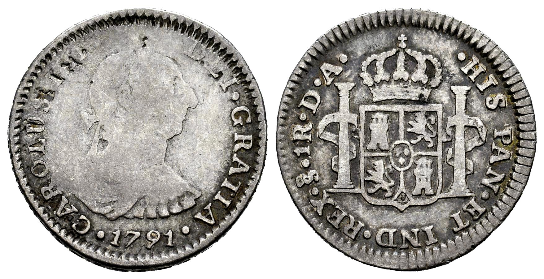 Carlos IV (1788-1808). 1 real. 1791. San Francisco. DA. (Cal-506 var). Ag. 3,21 g. Busto de Carlos III y ordinal IIII. Reverso parcialmente incuso en anverso, "HIS PAN" retrógrado sobre el ordinal. Ordinal IIII rectificado sobre III. Suave tono. Muy rara. Ex Áureo & Calicó (28/01/2009), lote 1122. BC+. Est...300,00.