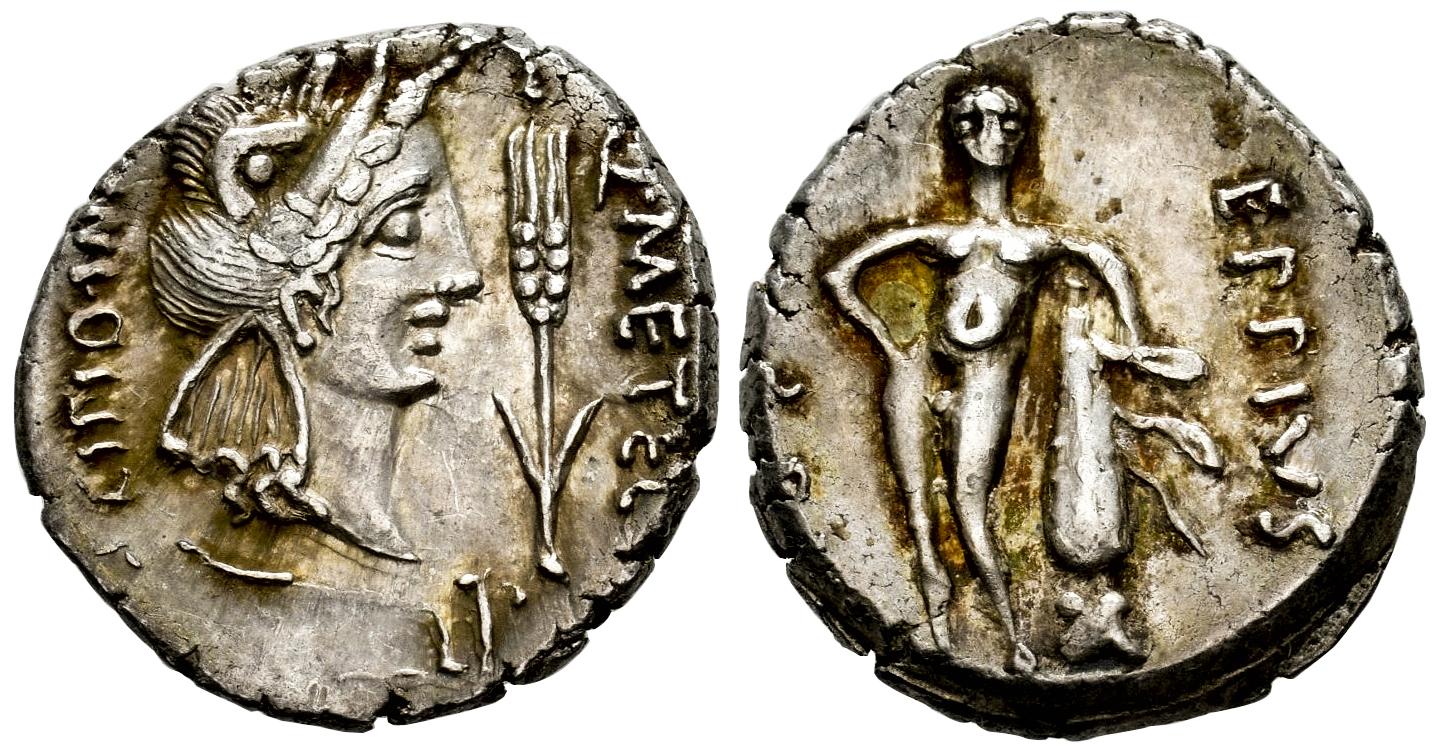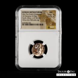Caecilia. Q. Caecilius Metellus Plus Scipio y M. Eppius. Denario. 47-46 a.C. África. (Ffc-216). (Craw-461/1). (Cal-291). Anv.: Cabeza de Africa a derecha, delante: espiga, debajo: arado, detrás: SCIPIO. IMP., delante: Q. METELL. Rev.: Hercules apoyándose sobre maza con piel de león,a izquierda: LEG. F.C., a derecha: EPPIVS. Ag. 3,94 g.