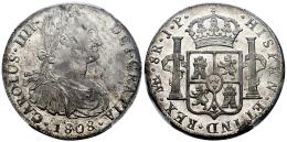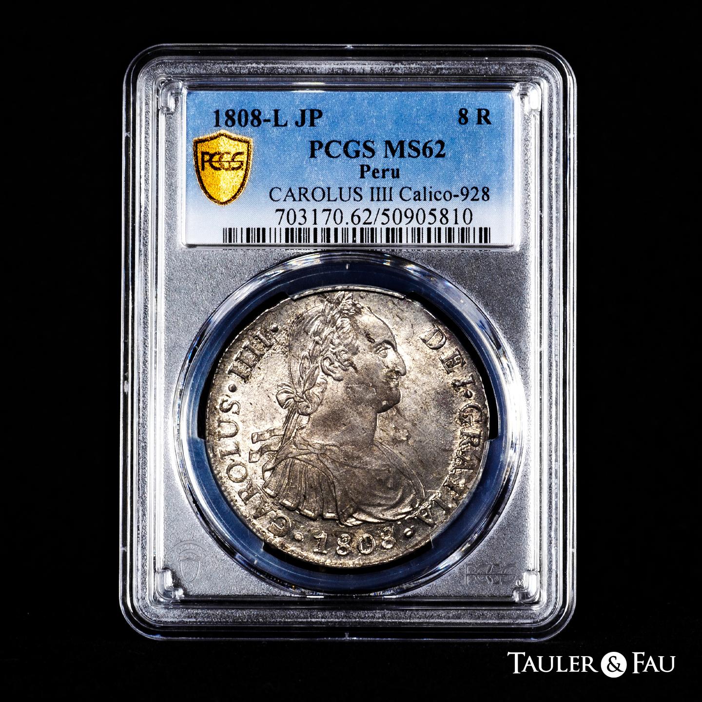 Carlos IV (1788-1808). 8 reales. 1808. Lima. JP. (Cal-928). Ag. Suave pátina y todo su brillo original. Alguna hoijta pero muy atractiva. Rara en esta conservación. Encapsulada por PCGS como MS 62. Est...600,00.