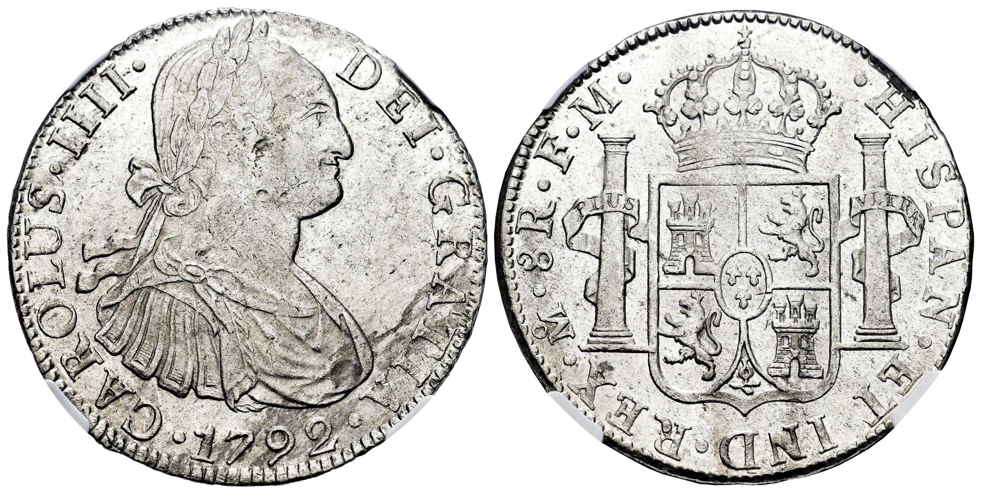 Carlos IV (1788-1808). 8 reales. 1792. México. FM. (Cal-954). Ag. Brillo original. Hojita en el busto y pequeñas marcas. Muy escasa en esta conservación. Encapsulada por NGC como MS 61. Est...700,00.