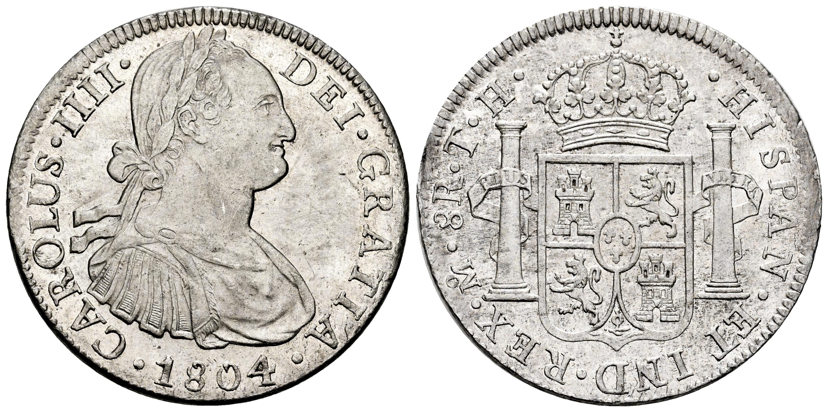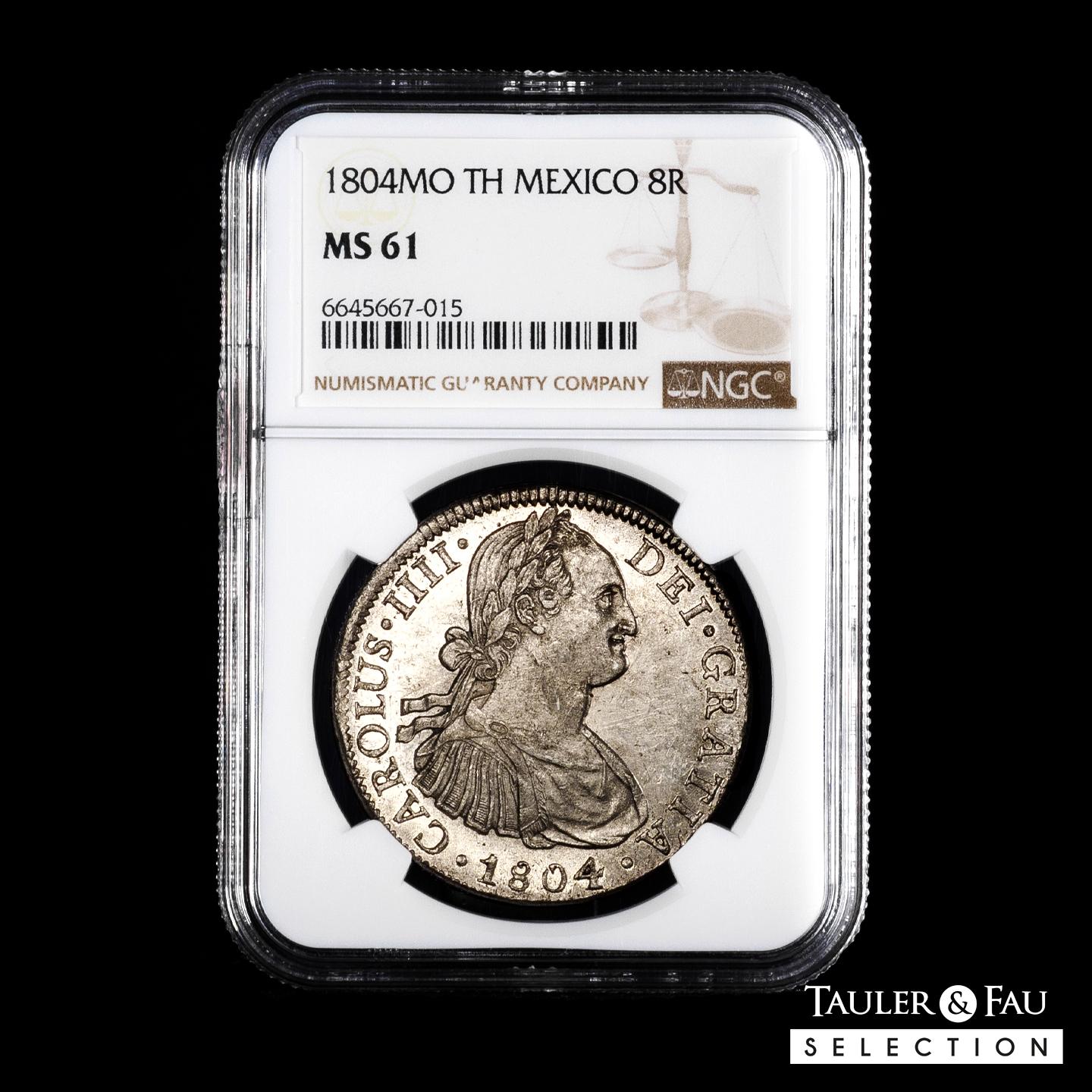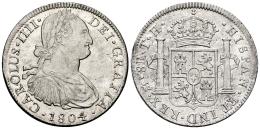 Carlos IV (1788-1808). 8 reales. 1804. México. TH. (Cal-980). Ag. Pleno brillo original. Ínfimas rayitas. Muy atractiva y escasa en esta conservación. Encapsulada por NGC como MS 61. Est...500,00.