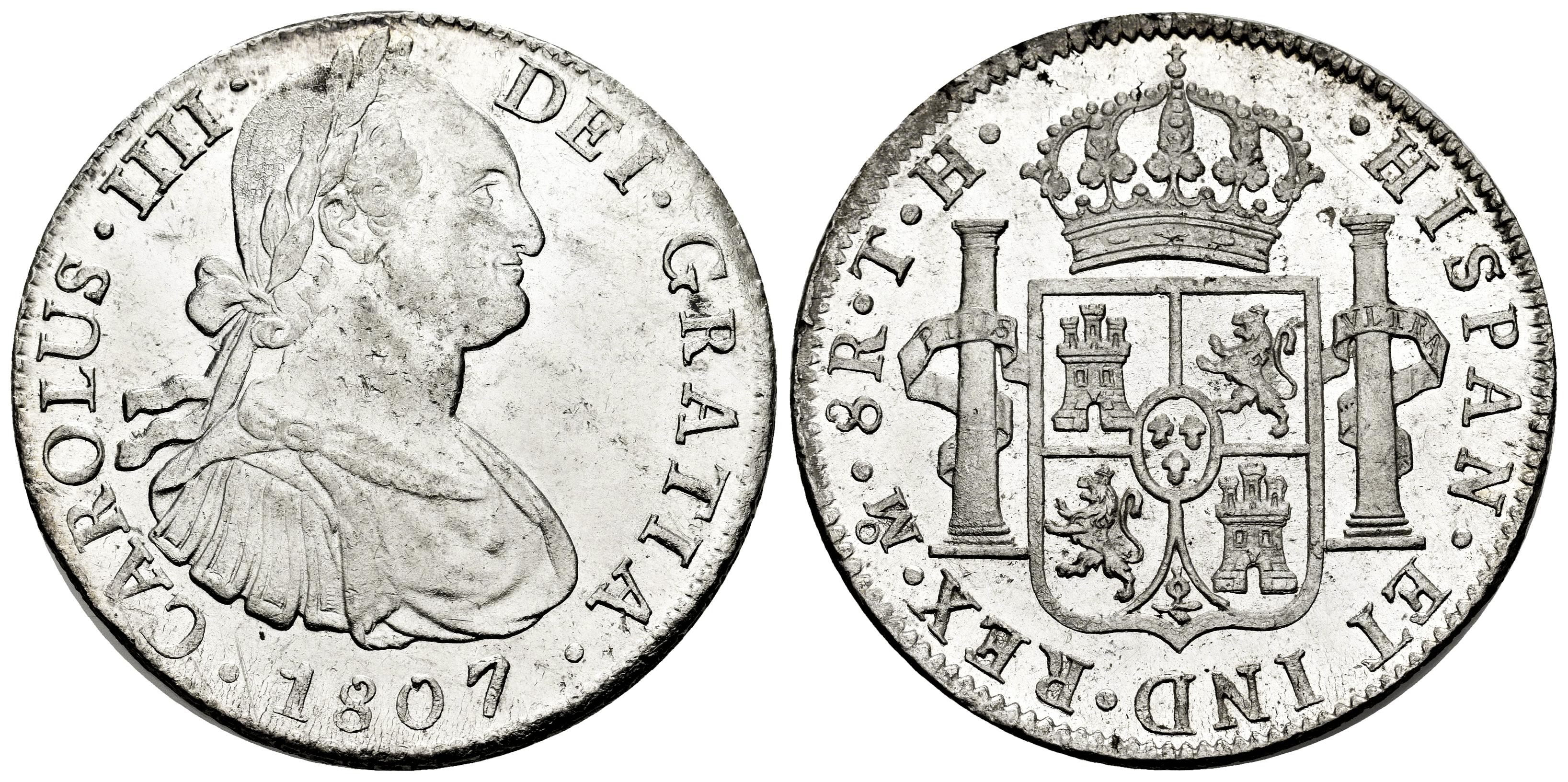 Carlos IV (1788-1808). 8 reales. 1807. México. TH. (Cal-986). Ag. 27,03 g. Magnífico ejemplar con pleno brillo original. Fuertemente acuñada con detalles nítidos y bien marcados, sobre todo en el reverso. Tan solo unas ínfimas rayitas en el anverso. Muy rara en esta conservación. SC/FDC. Est...700,00.