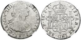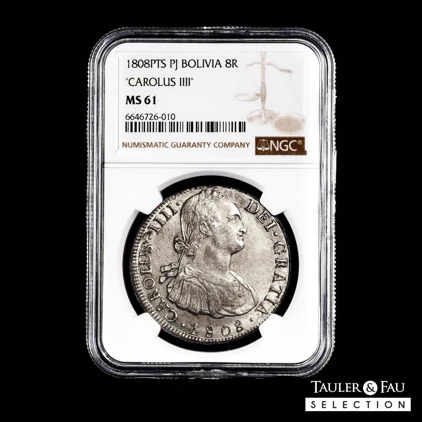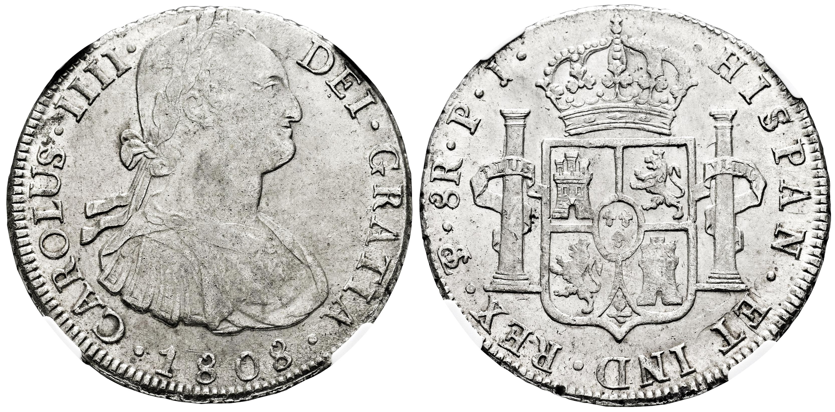 Carlos IV (1788-1808). 8 reales. 1808. Potosí. PJ. (Cal-1014). Ag. Restos de brillo original. Encapsulada por NGC como MS 61. Est...350,00.