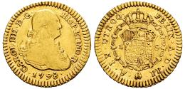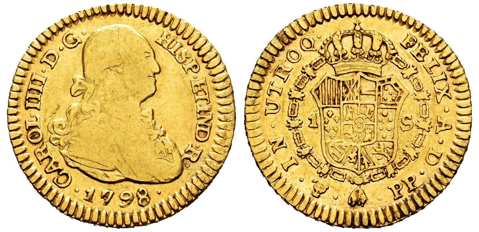 Carlos IV (1788-1808). 1 escudo. 1798. Potosí. PP. (Cal-1184). Au. 3,32 g. Leves restos de brillo original en reverso. Gráfilas completas. Conservación habitual para esta emisión. Muy rara. MBC-/MBC. Est...600,00.