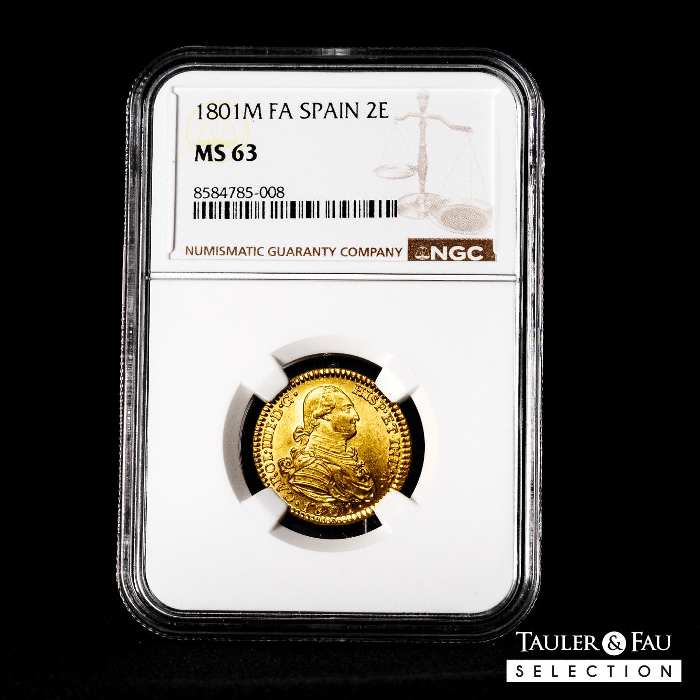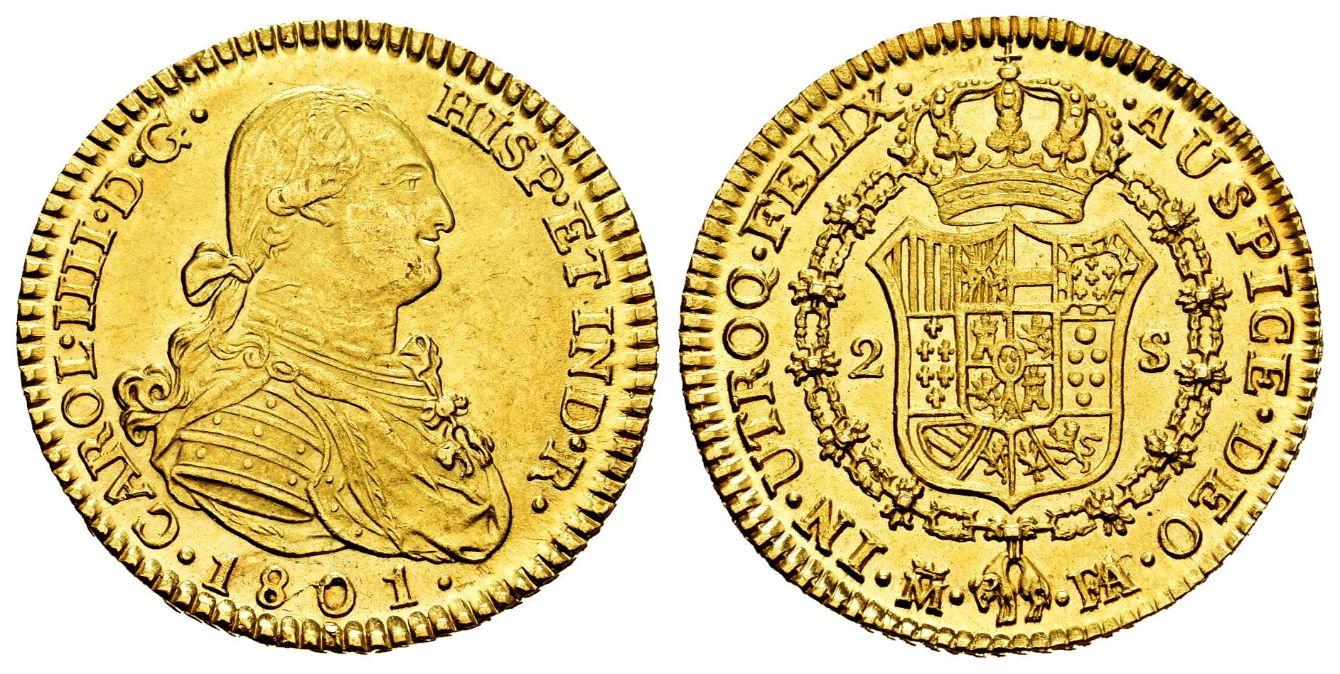 Carlos IV (1788-1808). 2 escudos. 1801. Madrid. FA. (Cal-1303). Au. 6,68 g. Precioso color y pleno brillo original. Excelente atractivo visual con superficies inmaculadas. Rara en esta conservación. Encapsulada por NGC como MS 63. Solamente 1 ejemplar mejor conservado según el censo de NGC. Est...1500,00.