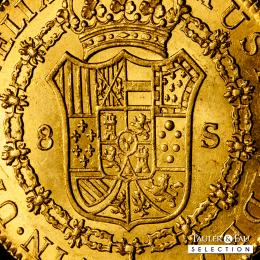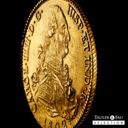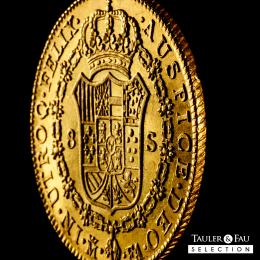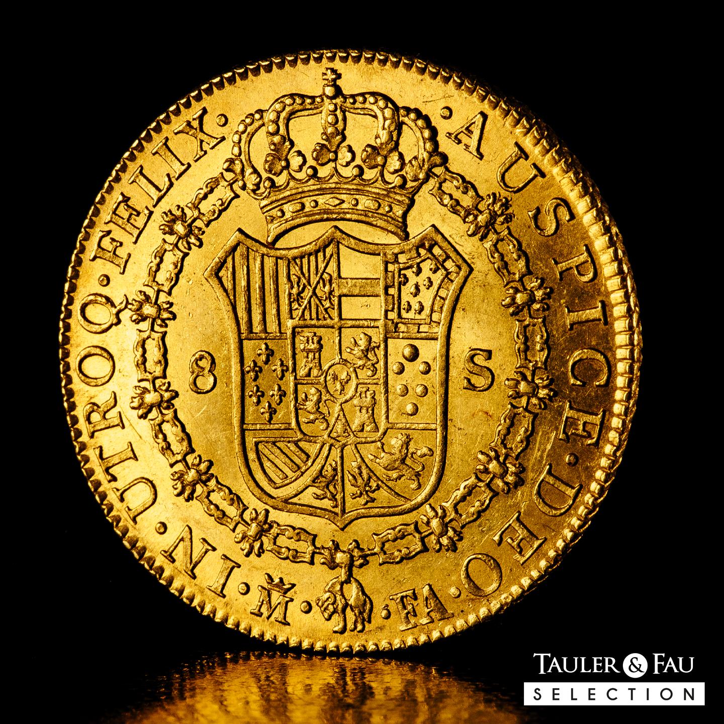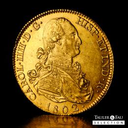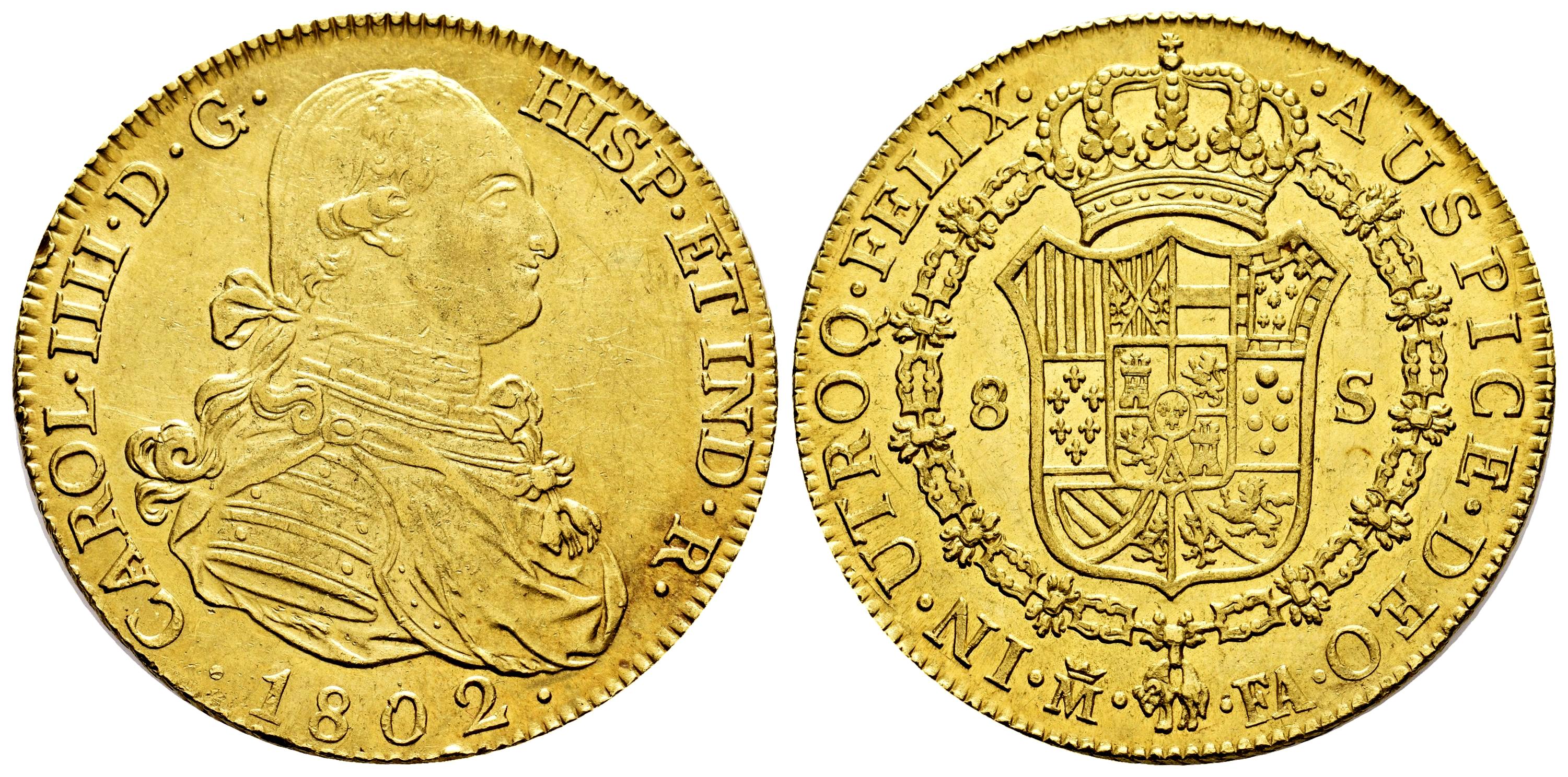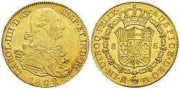 Carlos IV (1788-1808). 8 escudos. 1802. Madrid. FA. (Cal-1621). (Cal onza-1011). Au. 27,02 g. Golpe en el canto. Precioso color. Brillo original. Muy atractiva y rara en esta conservación. EBC+/SC-. Est...4000,00.