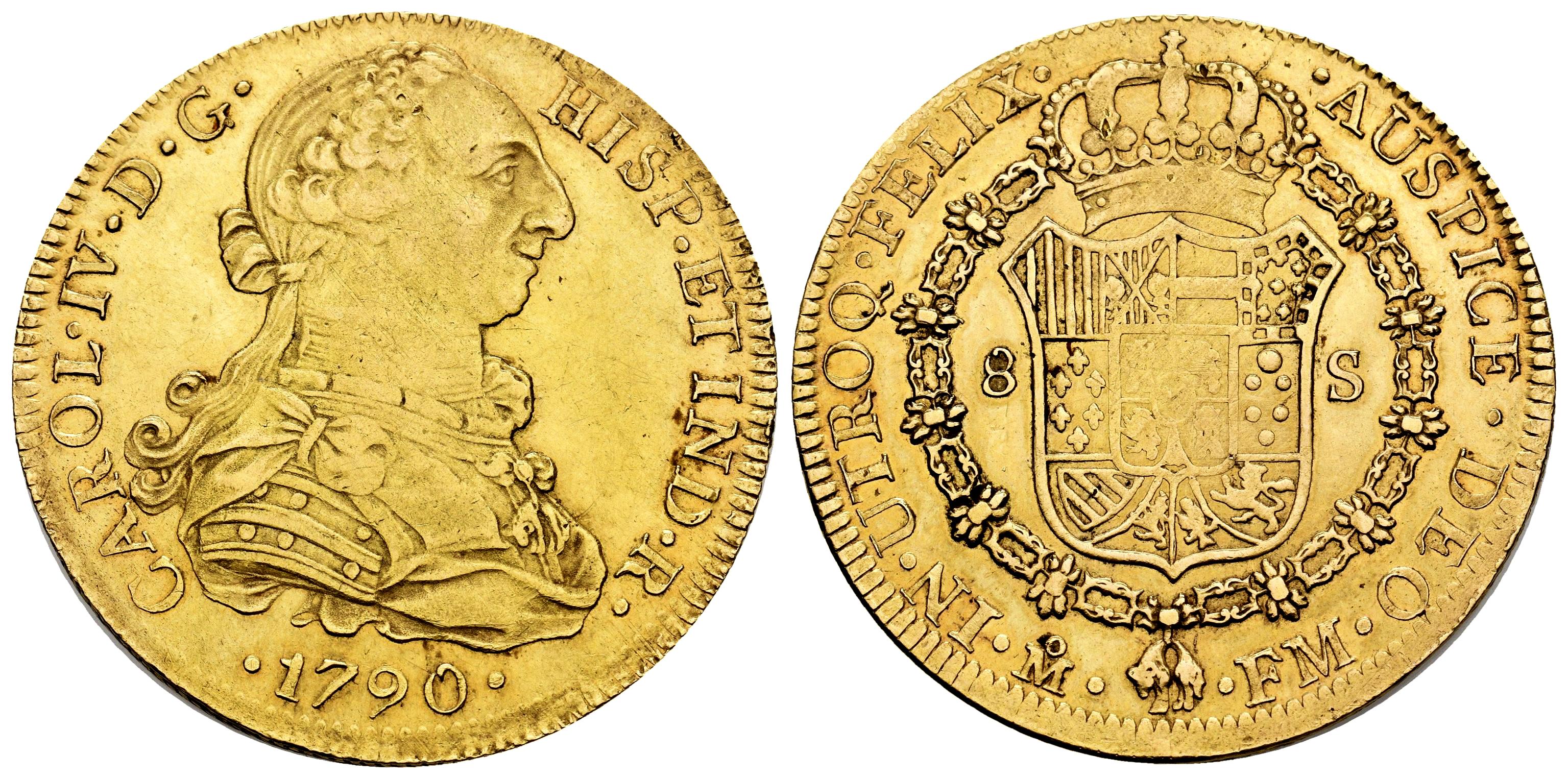 Carlos IV (1788-1808). 8 escudos. 1790. México. FM. (Cal-1628). (Cal onza-1016). Au. 27,12 g. Busto de Carlos III y ordinal del rey IV. Restos de brillo original. EBC. Est...3000,00.