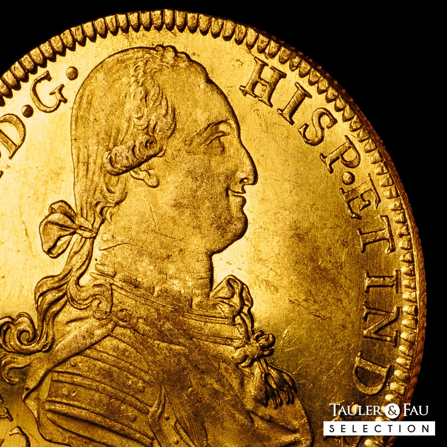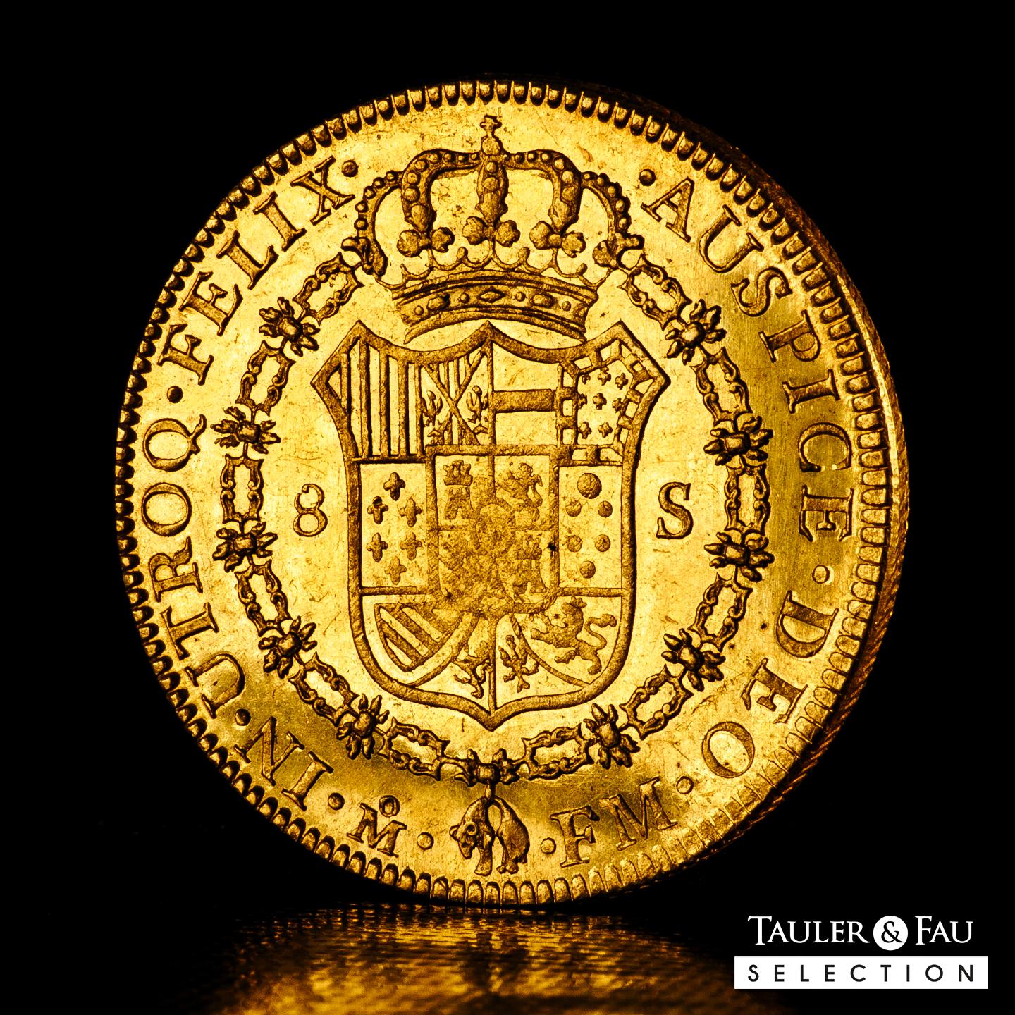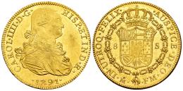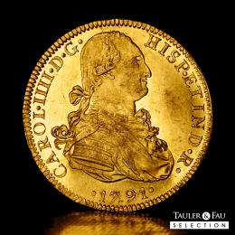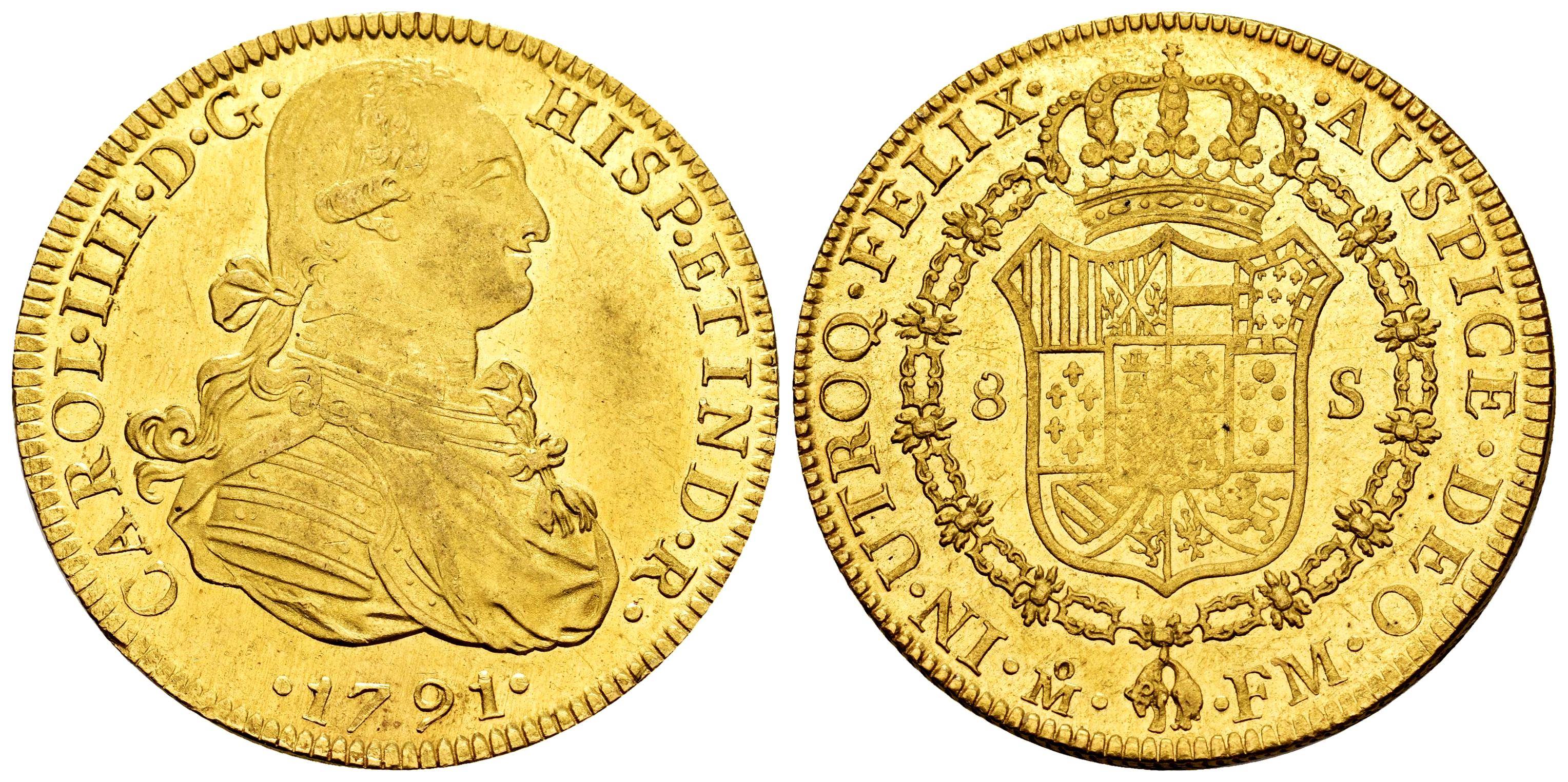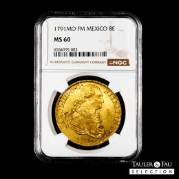 Carlos IV (1788-1808). 8 escudos. 1791. México. FM. (Cal-1630). (Cal onza-1018). Au. 27,06 g. Pleno brillo original con un color amarillo intenso. Ínfimas rayitas en el campo del anverso y ligera debilidad en los centros, aun así muy atractiva. Rara en esta conservación. Encapsulada por NGC como MS 60. Ex Triton XVI (8-9/01/2013), lote 1517. Conserva la etiqueta de la subasta. Est...5000,00.