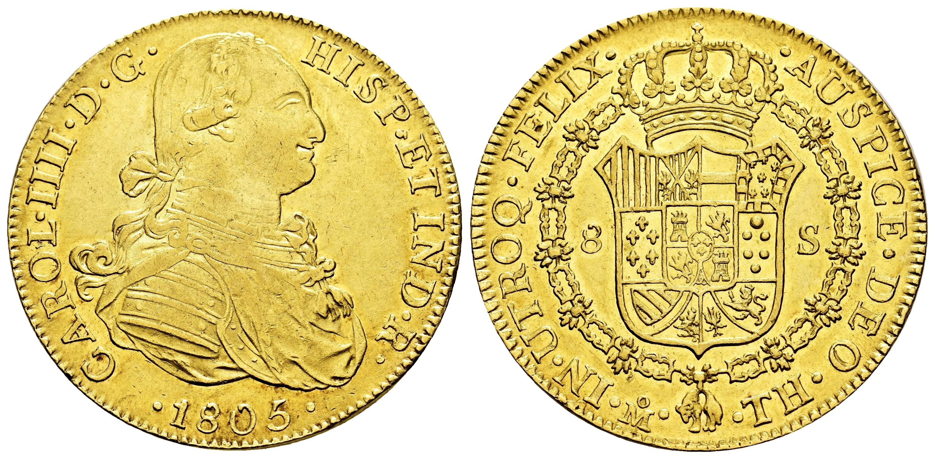 Carlos IV (1788-1808). 8 escudos. 1805. México. TH. (Cal-1649). (Cal onza-1041). Au. 27,04 g. Acuñación algo floja en anverso. Brillo original, sobre todo en el reverso. EBC/EBC+. Est...4000,00.