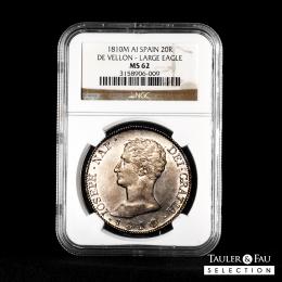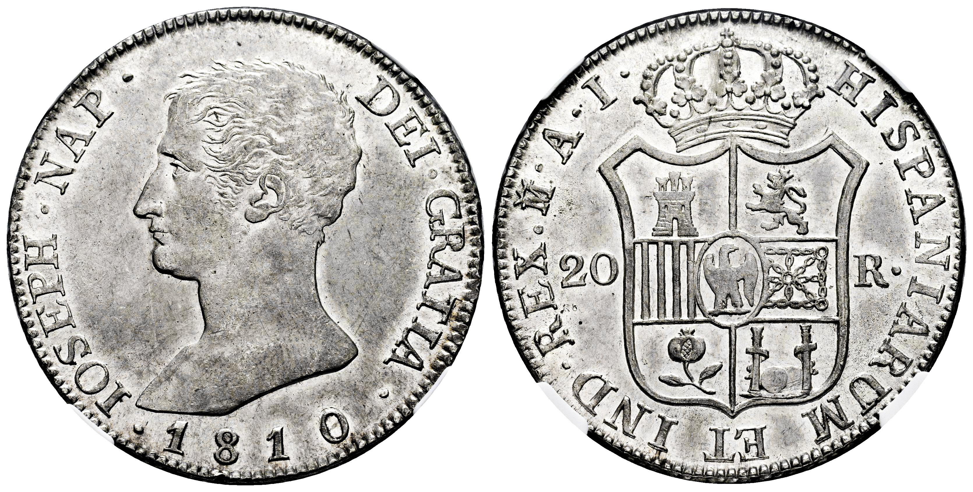 José Napoleón (1808-1814). 20 reales. 1810. Madrid. AI. (Cal-37). Ag. Águila grande. Suave tono. Pleno brillo original. Muy escasa en esta conservación. Encapsulada por NGC como MS 62. Est...1000,00.
