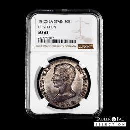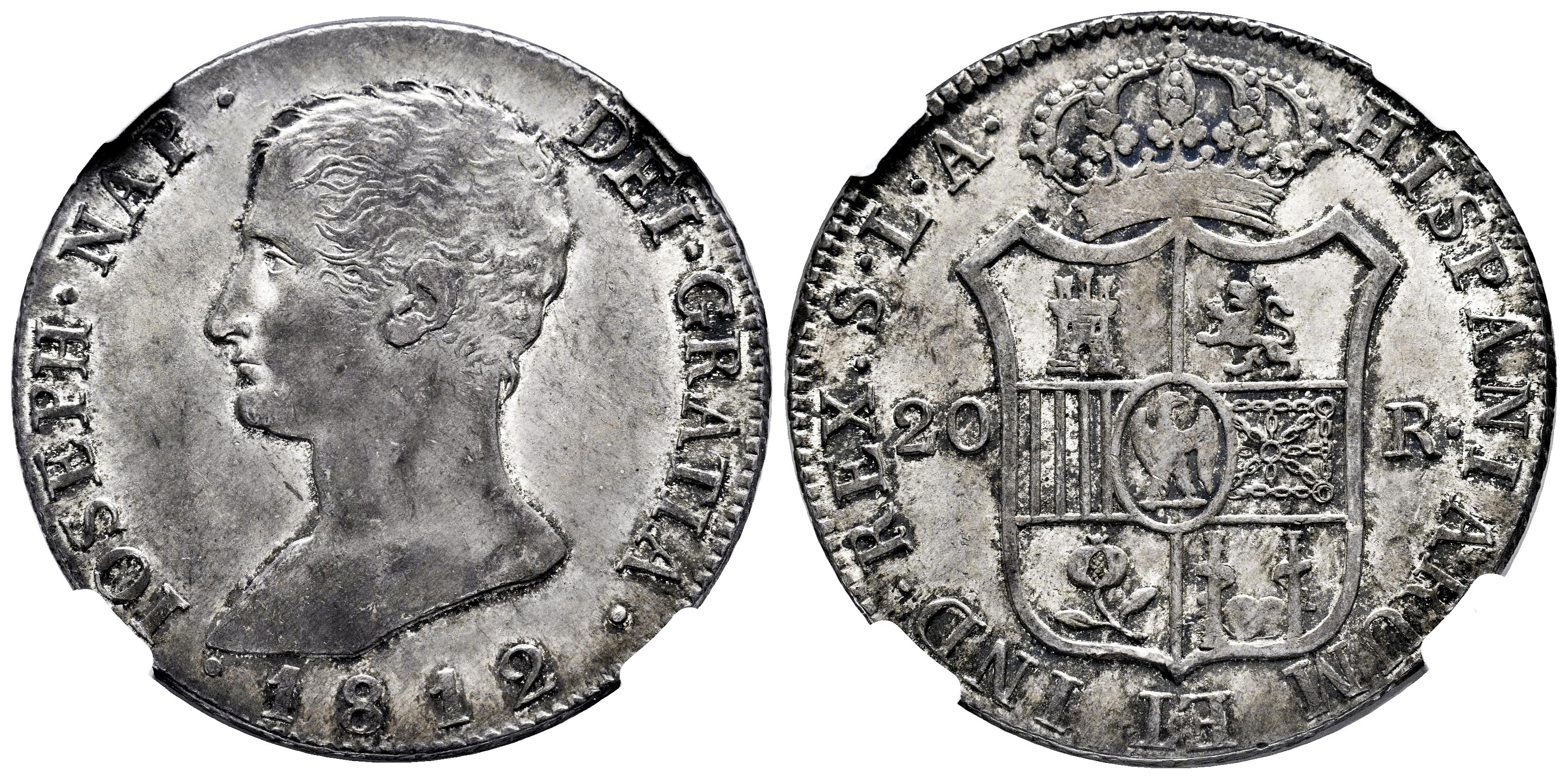 José Napoleón (1808-1814). 20 reales. 1812. Sevilla. LA. (Cal-45). Ag. Pátina de monetario con brillo original subyacente. Muy rara en esta conservación. Encapsulada por NGC como MS 63 (Top Pop), el mejor ejemplar conservado en el censo de NGC. Est...3500,00.