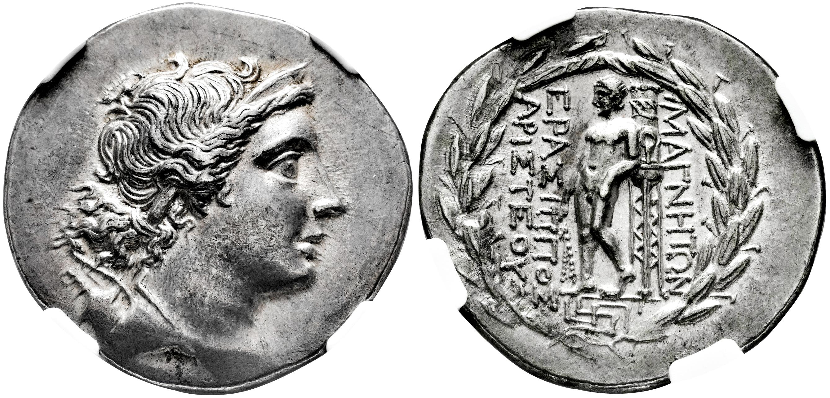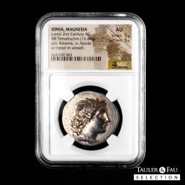 Ionia. Magnesia y Maeandrum. Tetradracma. 155-145 a.C. Magistrado Erasippos, hijo de Aristeos. (Sng von Aulock-2042). (SNG Lockett-2829). (Sng Delepierre-2642). Anv.: Busto de Artemisa con diadema y drapeado a la derecha, arco y carcaj sobre el hombro. Rev.: Apolo Delphios en pie a la izquierda, codo izquierdo apoyado en un trípode alto detrás, sosteniendo en la mano derecha una rama atada con cintas; EPAΣIΠΠOΣ APIΣTEOY a la izquierda, MAΓNHTΩN a la derecha, patrón de meandro debajo; todo dentro de una corona de laurel. Ag. 16,68 g. Suave pátina. Rara en esta conservación. Encapsulada por NGC como AU, strike 5/5, surface 5/5. Est...2000,00.