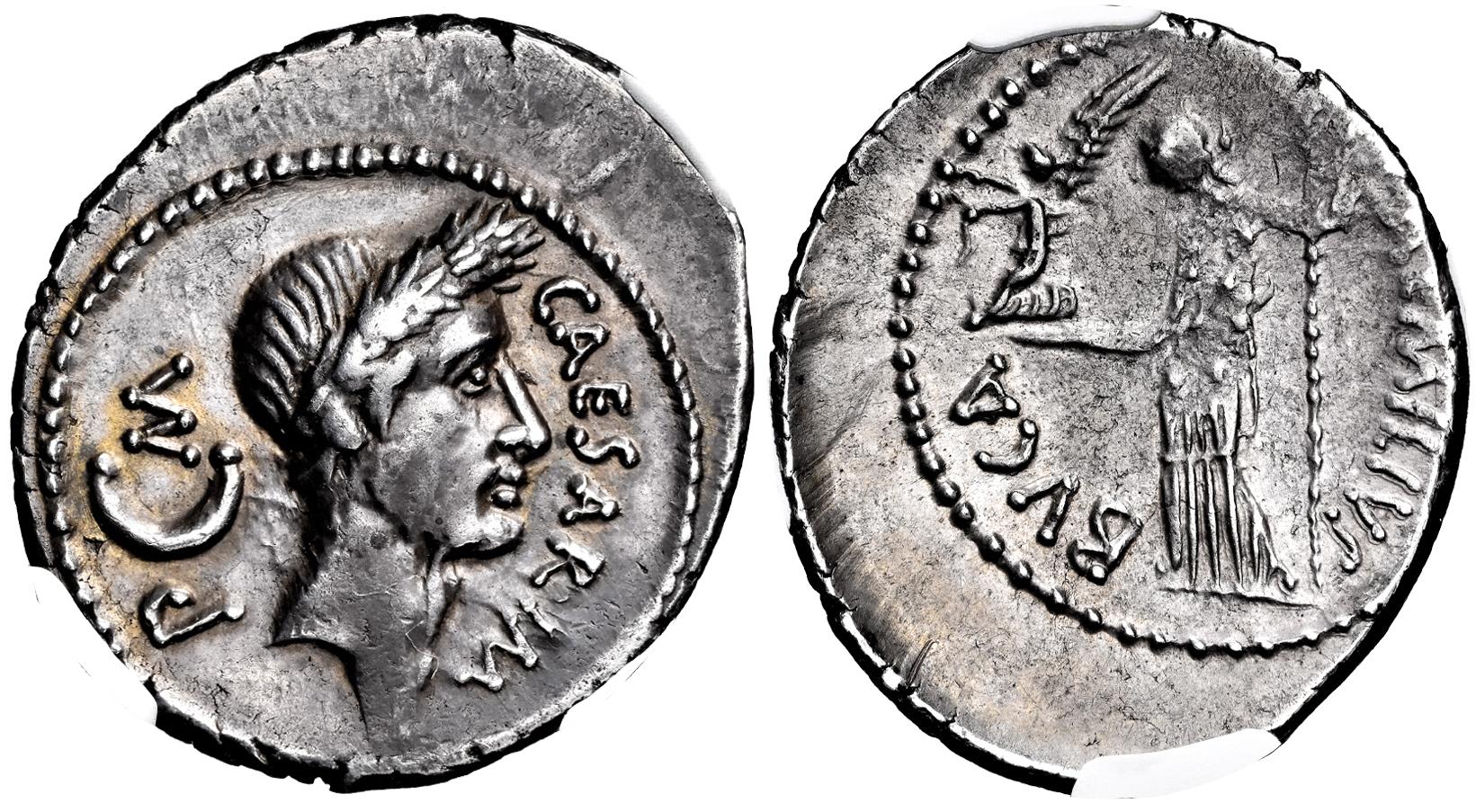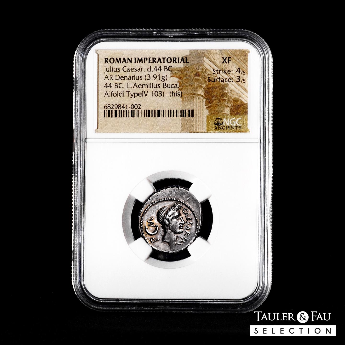 Julio César. L. Aemilius Buca. Denario. 44 a.C. Galia. (Alföldi Type IV, 103 A8/R4 - mismo ejemplar). (Ffc-17). (Craw-480/4). (Sydenham-1060). Anv.: Cabeza laureada de César a derecha; leyenda CAESAR • IM descendente a la derecha; gran creciente que divide P M ascendente a la izquierda.. Rev.: Venus Victrix de pie a izquierda, sosteniendo una Victoria en la mano derecha extendida y apoyada en un cetro con la izquierda; L • AEMILIVS BVCA en círculo desde la parte superior derecha. Ag. 3,91 g.