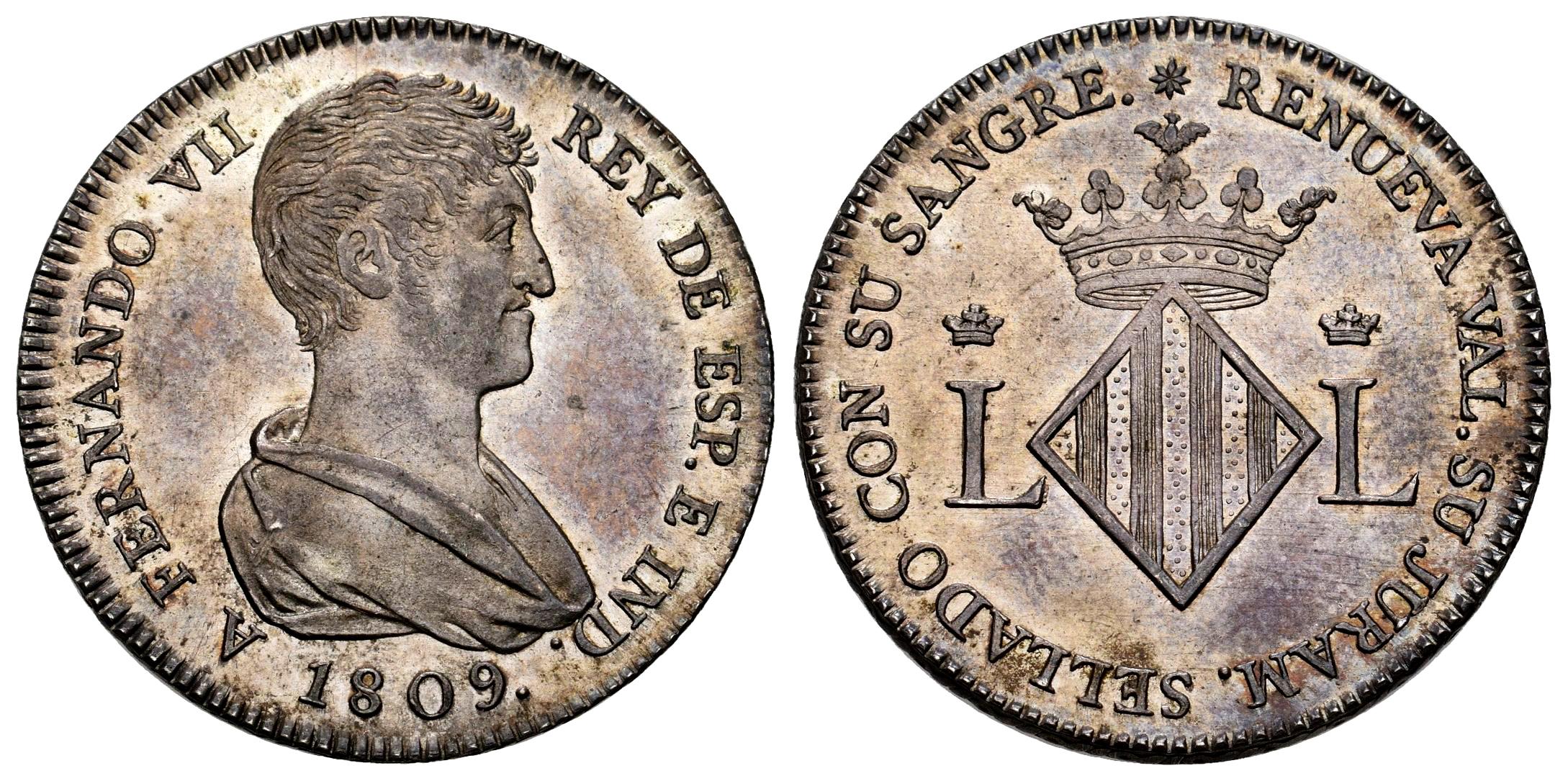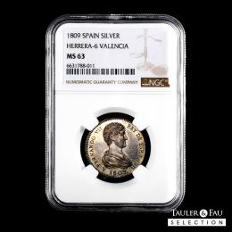 Fernando VII (1808-1833). Medalla de proclamación. 1809. Valencia. (Herrera-6). Ag. Suave tono y pleno brillo original. Rara en esta conservación. Encapsulada por NGC como MS 63. Est...600,00.