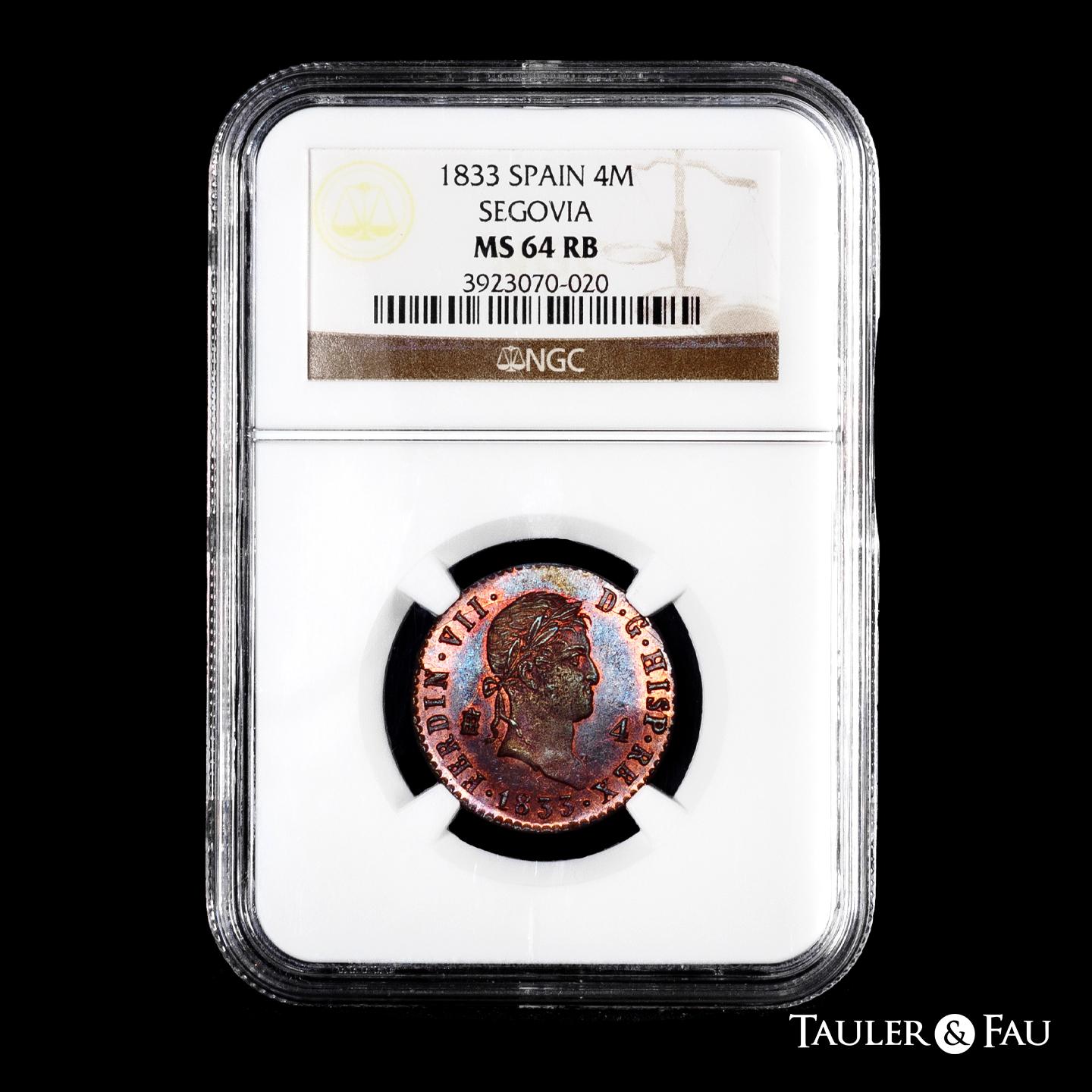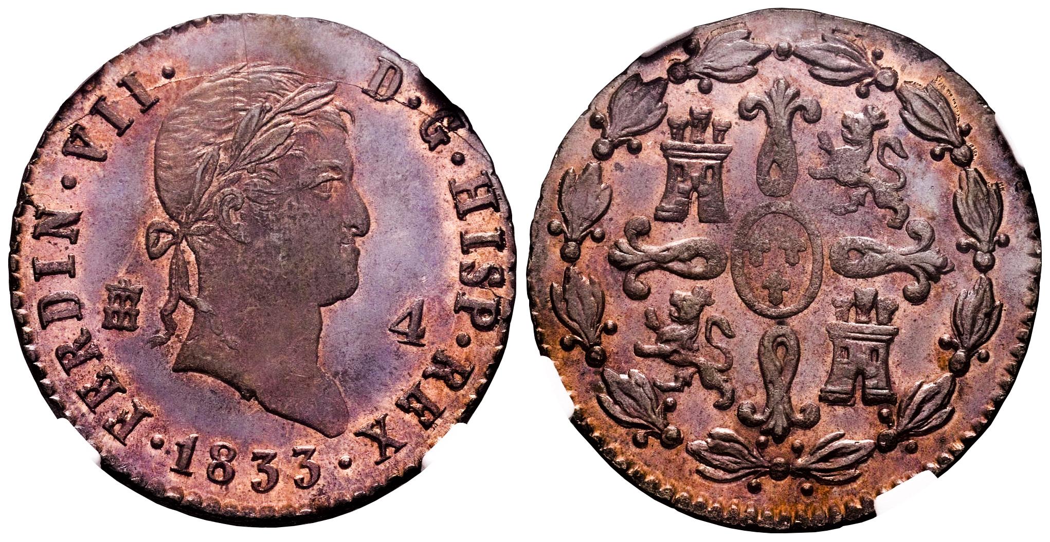 Fernando VII (1808-1833). 4 maravedís. 1833. Segovia. (Cal-188). Ae. Brillo original. Precioso color. Rara en esta conservación. Encapsulada por NGC como MS 64 RB. Solamente 1 ejemplar mejor conservado según el censo de NGC. Est...300,00.