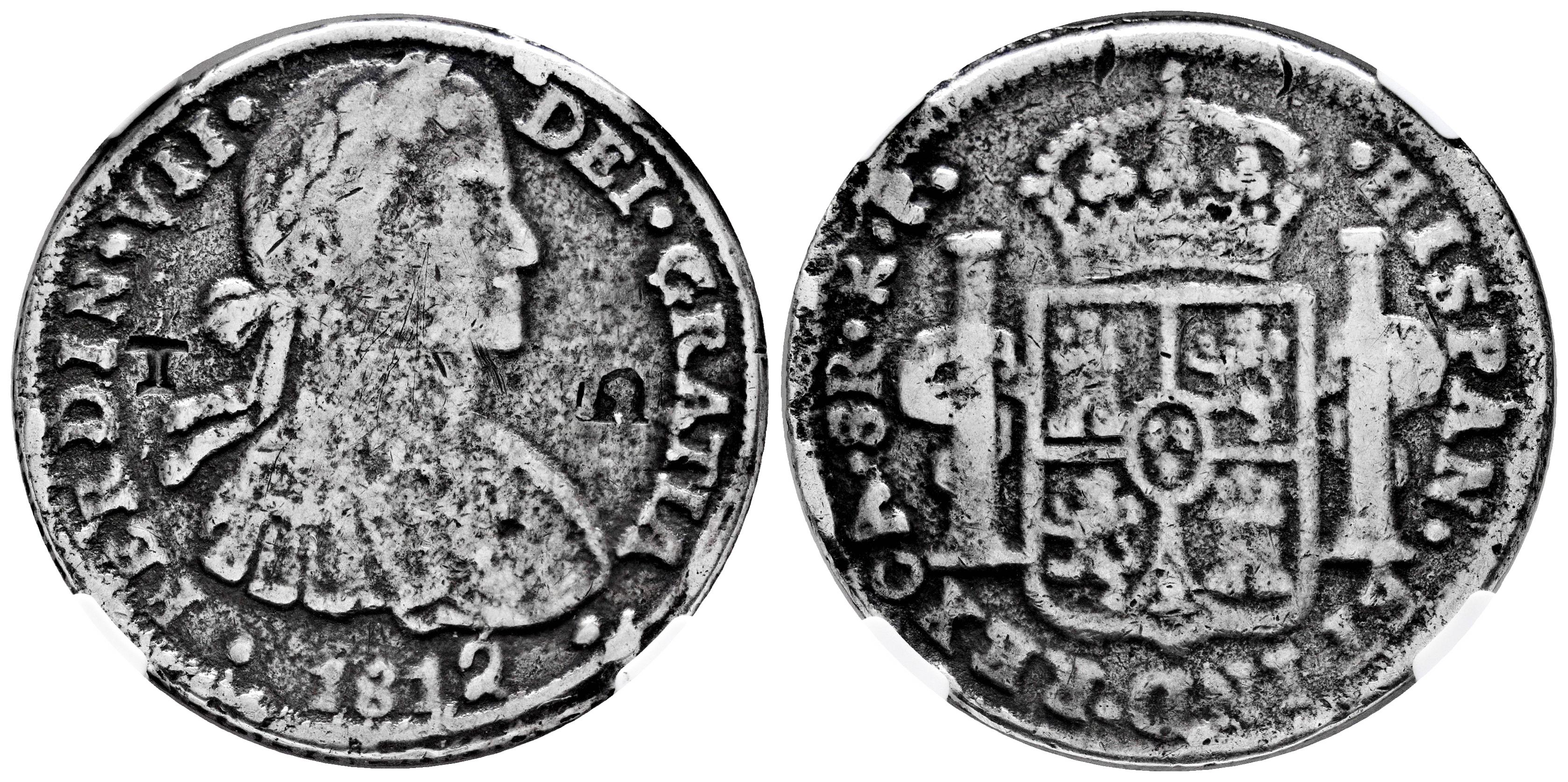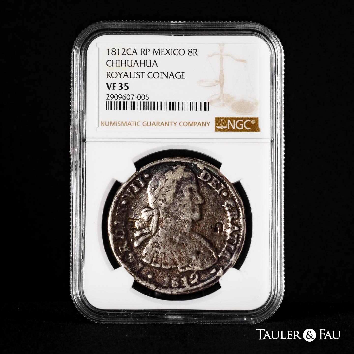 Fernando VII (1808-1833). 8 reales. 1812. Chihuahua. RP. (Cal-1164). (Ramírez-C8.2.1a). Ag. Busto imaginario. Plata fundida. Variedad sin punto entre REX y la marca de ceca CA. Buen ejemplar para este tipo. Rara, todavía más en esta conservación. Encapsulada por NGC como VF 35. Solamente 1 ejemplar mejor conservado según el censo de NGC. Est...1200,00.
