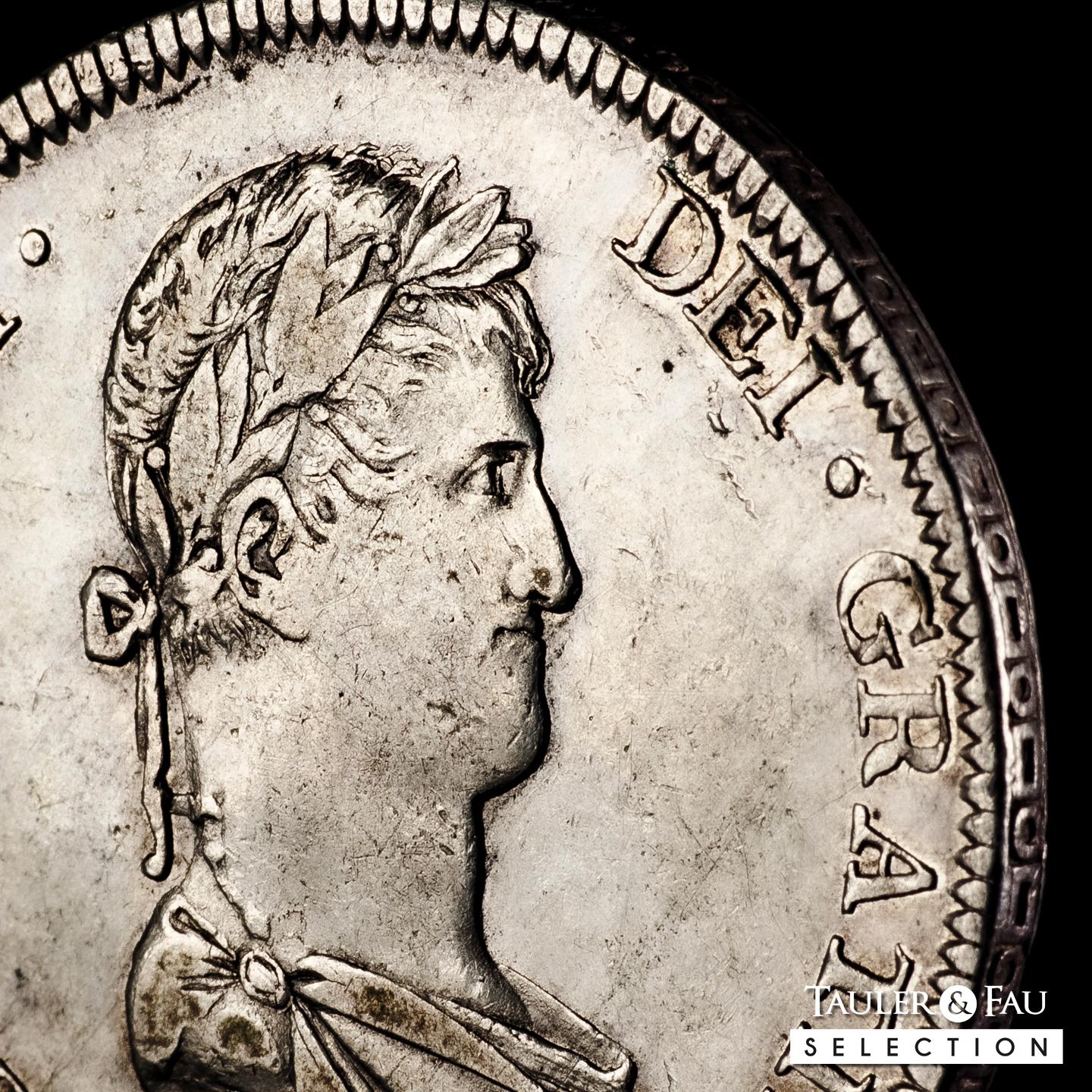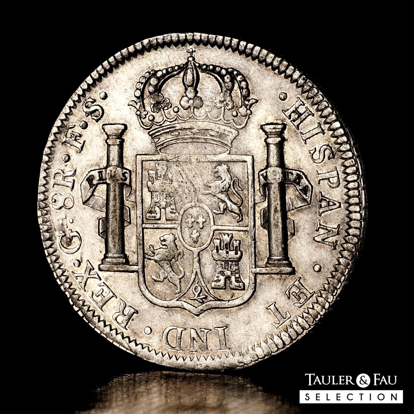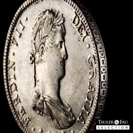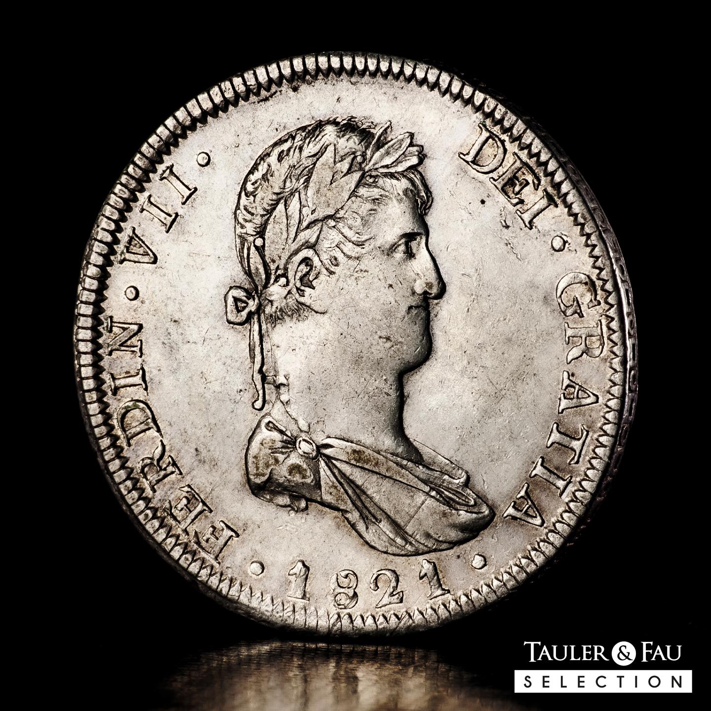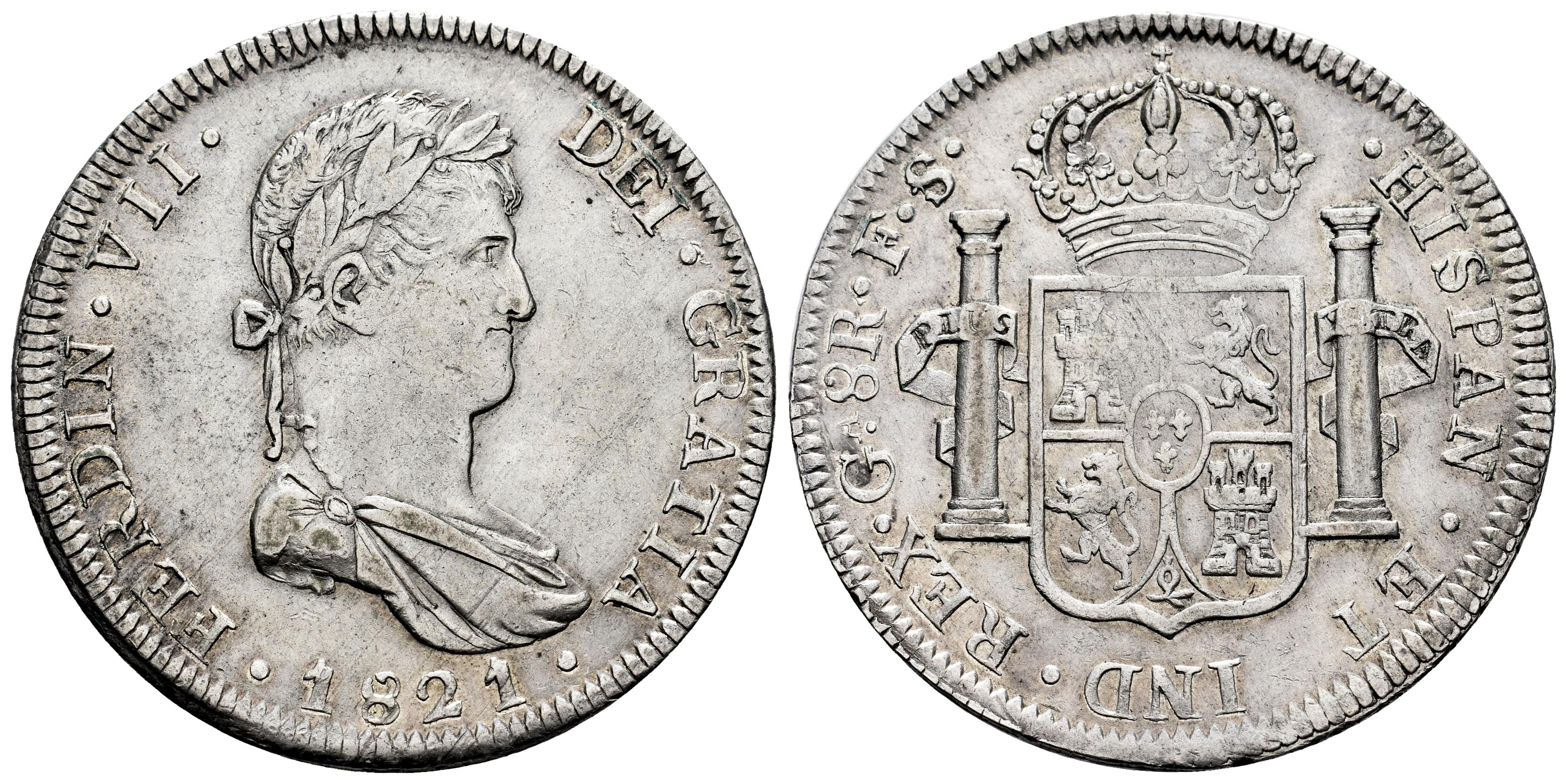 Fernando VII (1808-1833). 8 reales. 1821. Guadalajara. FS/**. (Cal-1210 var). Ag. 26,93 g. Ejemplar similar al subastado por Briggs&Bustos (08/09/2025), lote 208, donde exponen lo siguiente; Variedad mayormente desconocida, que presenta un curioso detalle: estrellas debajo de las iniciales del ensayador FS. Probablemente se trate de una acuñación temprana, dado que el escudo muestra elementos como la corona y las columnas de un diseño prácticamente idéntico al que se observa en piezas de 1818.