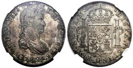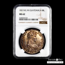 Fernando VII (1808-1833). 8 reales. 1821. Guatemala. M. (Cal-1236). Ag. Bonita pátina y brillo original. Muy escasa en esta conservación. Encapsulada por NGC como MS 62. Est...700,00.