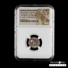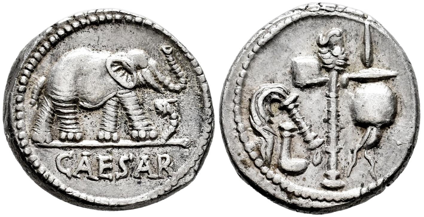 Julio César. Denario. 54-51 a.C. Galia. (Ffc-50). (Craw-443/1). (Cal-640). Anv.: Elefante a derecha, delante una serpiente, en el exergo: CAESAR. Rev.: Símpulo, aspersorio, hacha y apex. Ag. 3,93 g.