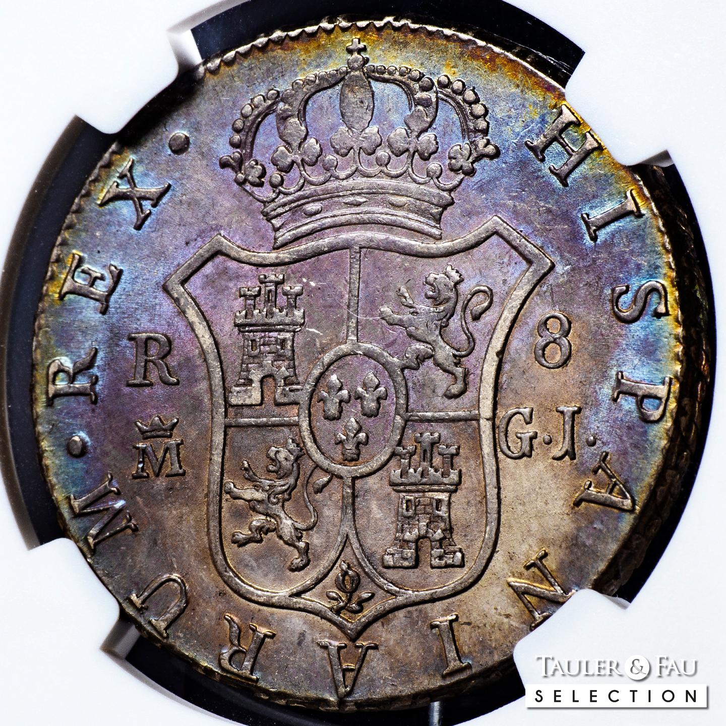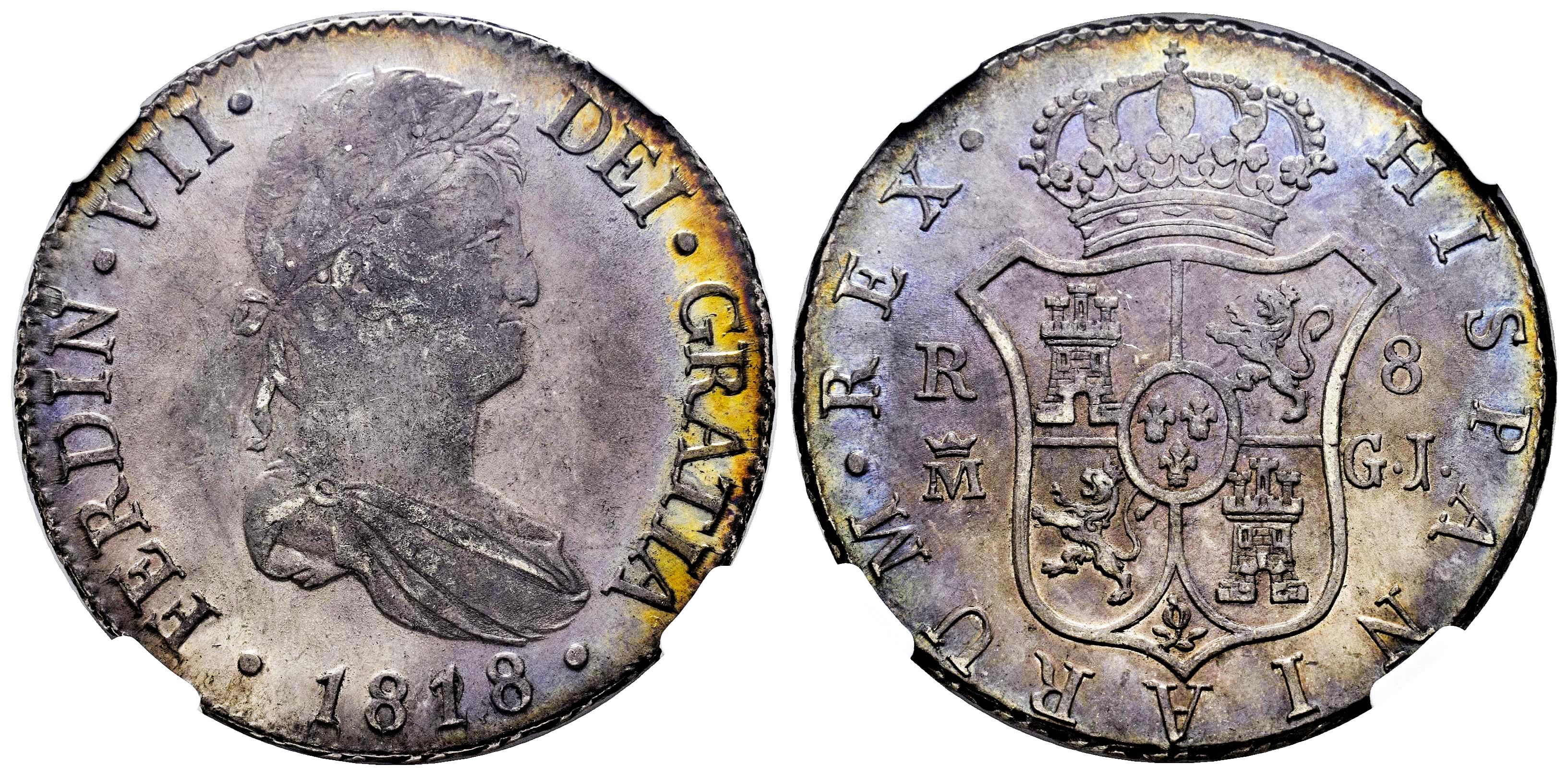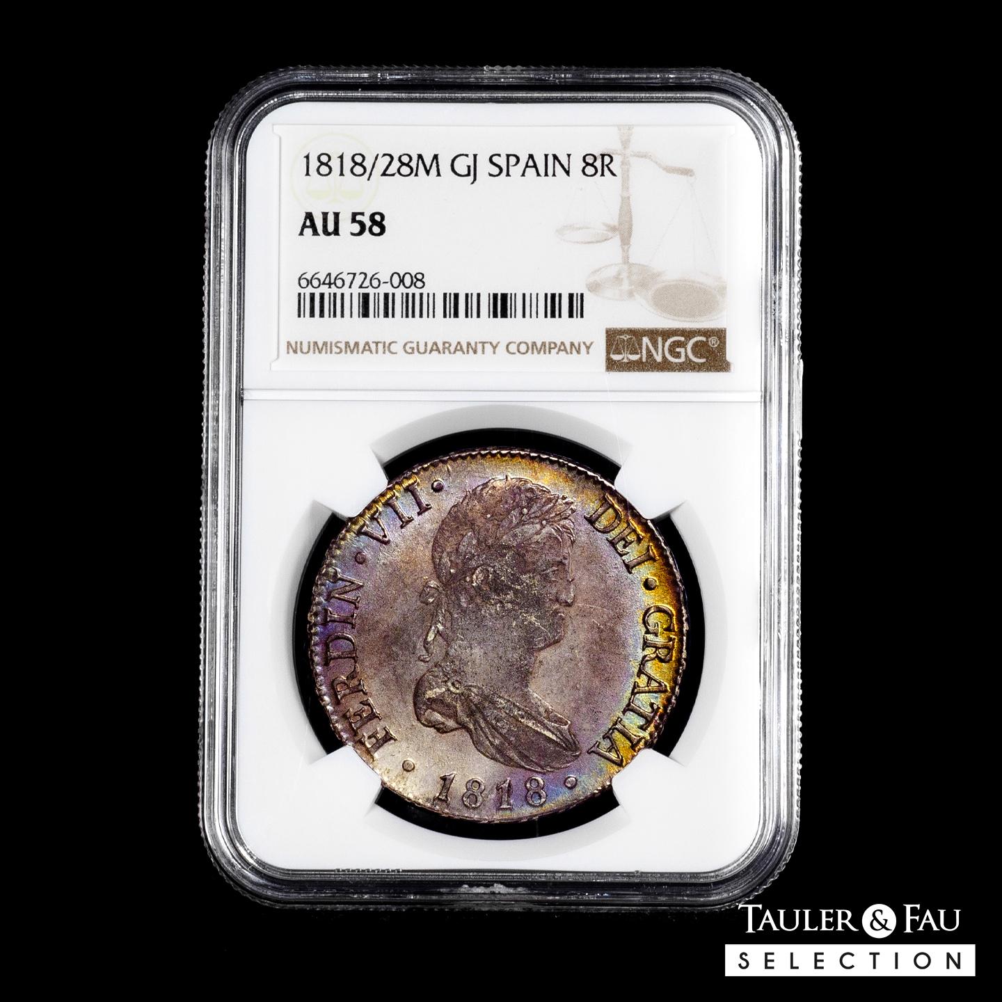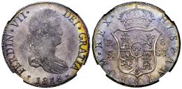 Fernando VII (1808-1833). 8 reales. 1818/28. Madrid. GJ. (Cal-1274). Ag. Sobrefecha. Pátina con un precioso tono iridiscente. Rara en esta conservación. Encapsulada por NGC como AU 58. Solamente 1 ejemplar mejor conservado según el censo de NGC. Est...700,00.