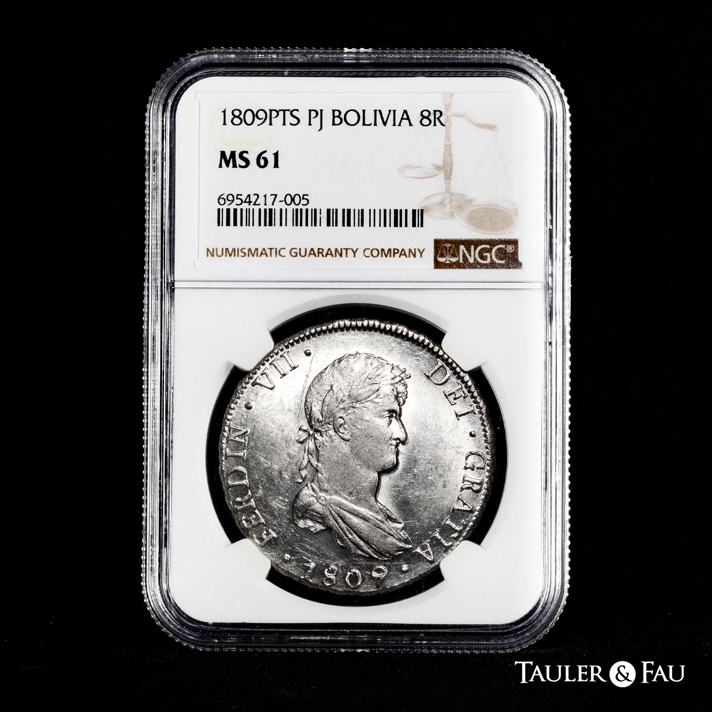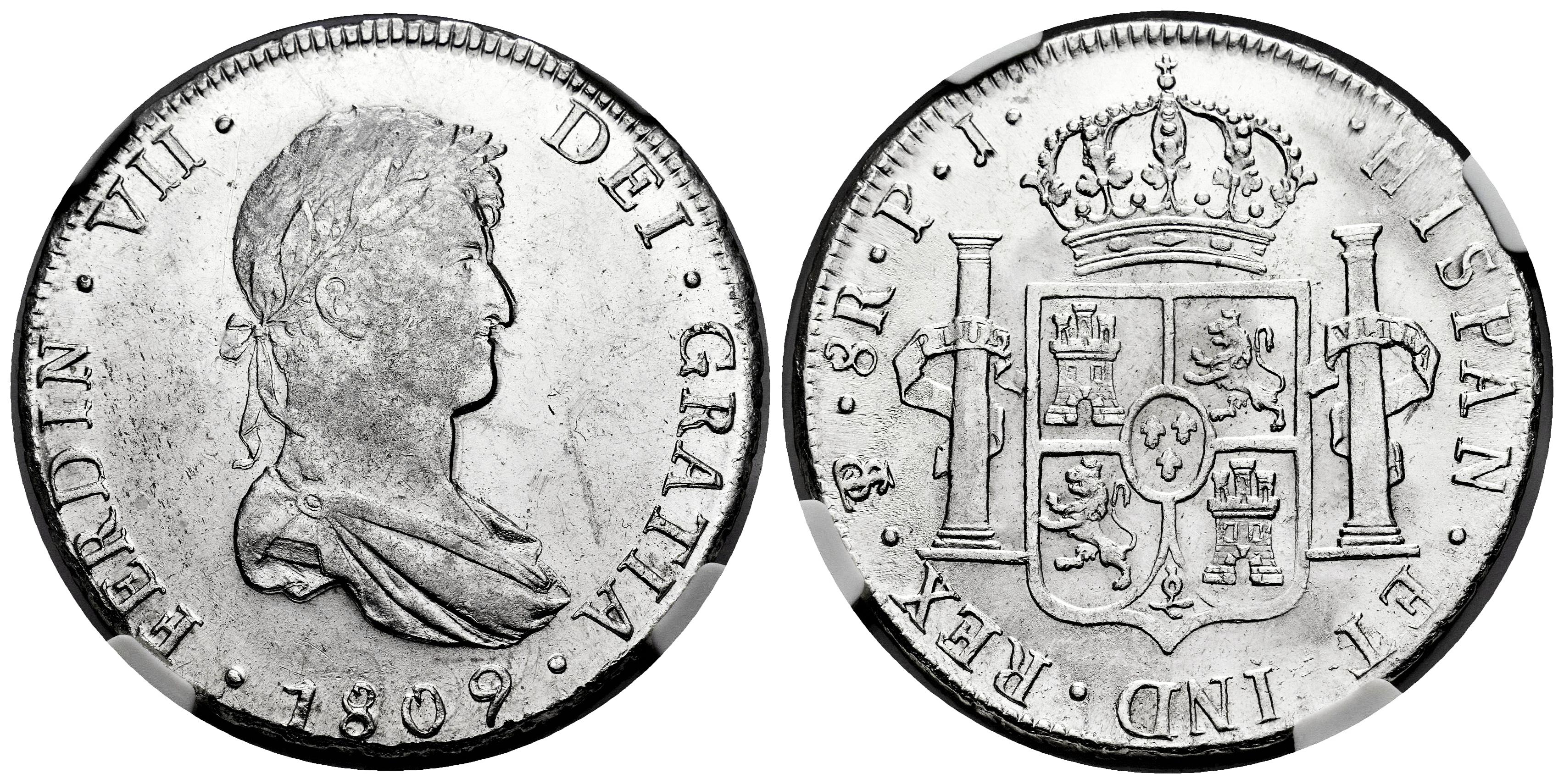 Fernando VII (1808-1833). 8 reales. 1809. Potosí. PJ. (Cal-1374). Ag. Brillo original. Encapsulada por NGC como MS 61. Solamente 1 ejemplar mejor conservado según el censo de NGC. Est...350,00.