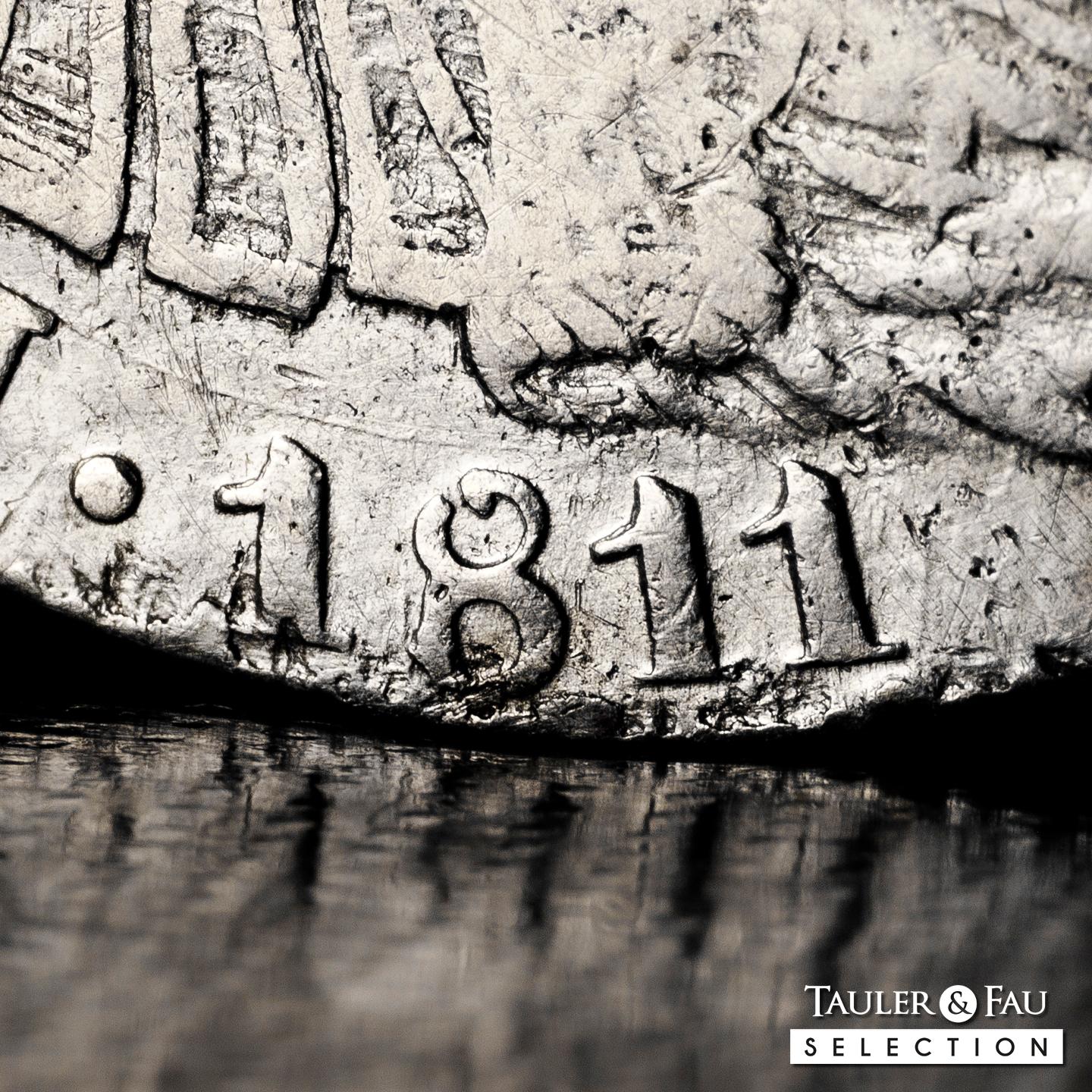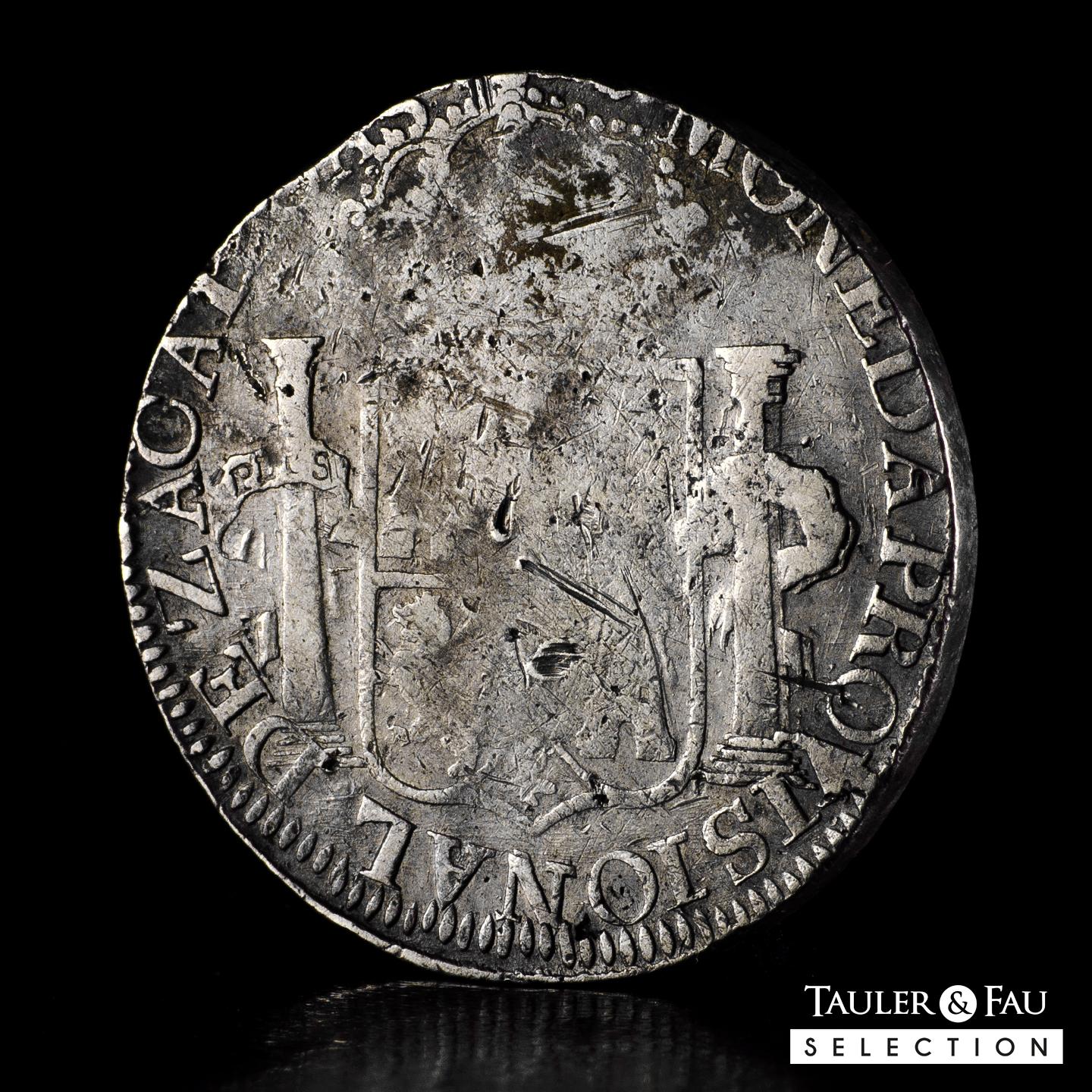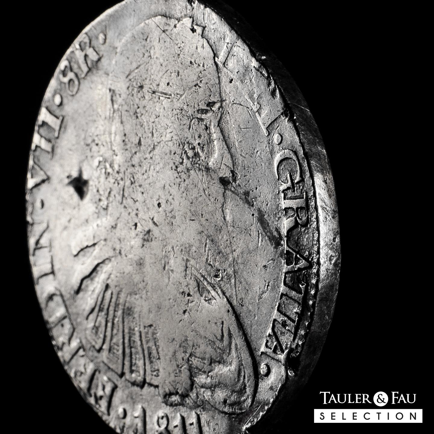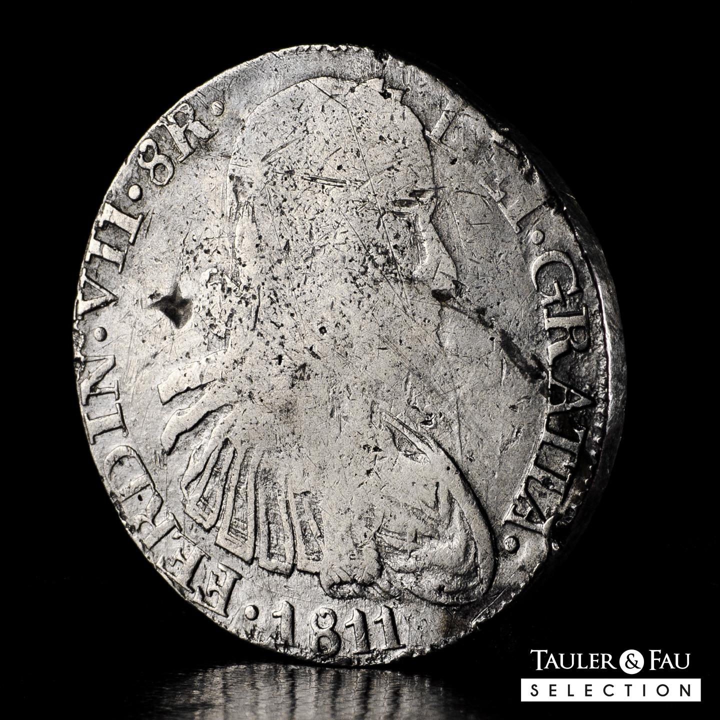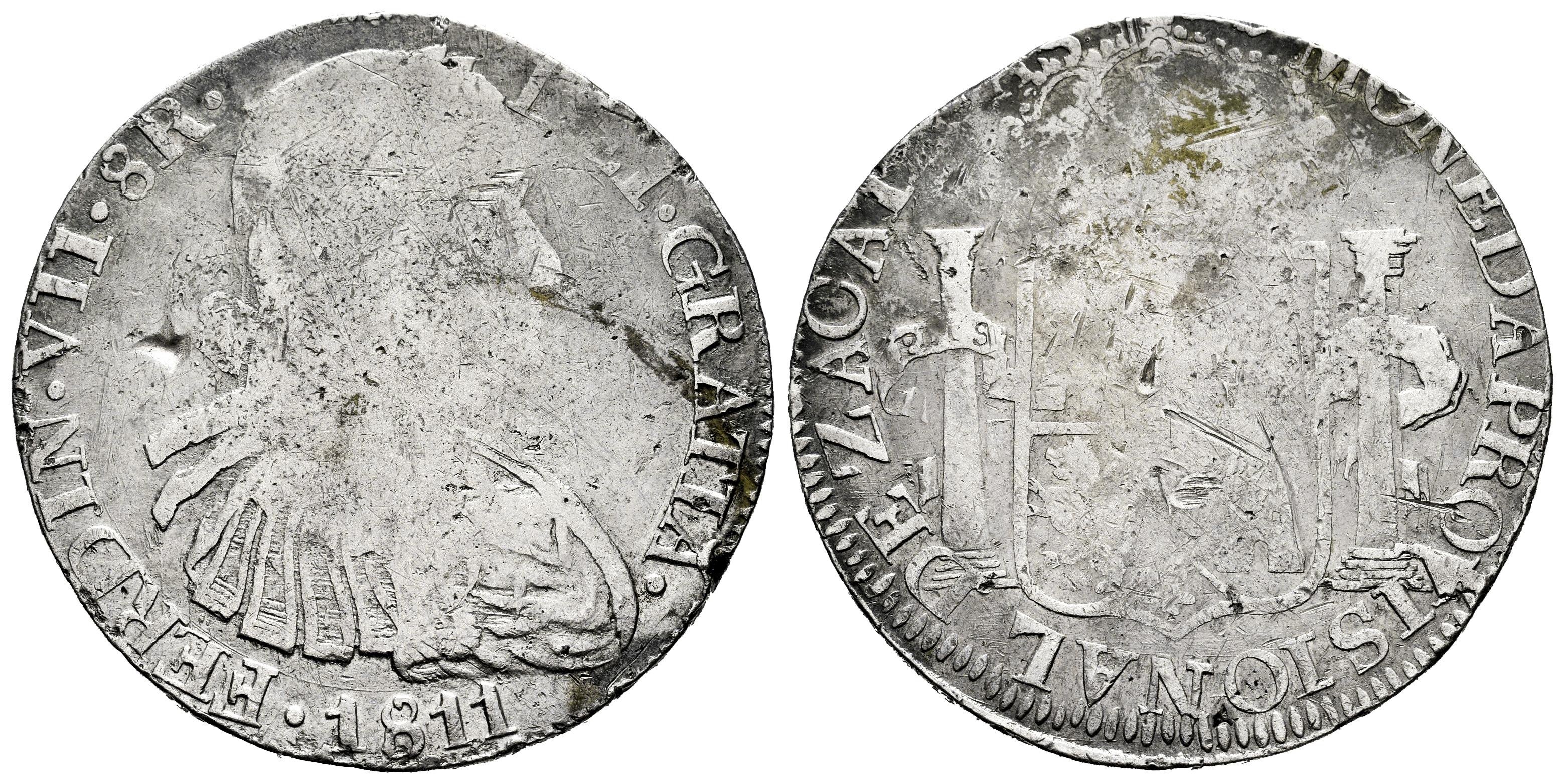 Fernando VII (1808-1833). 8 reales. 1811. Zacatecas. Moneda Provisional. (Cal-1448). (Ramírez-Z8.1.3). Ag. 26,87 g. Busto imaginario. Primera fecha acuñada con este tipo de busto. Canto liso. A pesar del carácter generalmente tosco de esta emisión, este ejemplar destaca por la nitidez y legibilidad de sus leyendas, completas y muy superiores al promedio conocido para este tipo. La fecha se muestra completamente visible. Ligeras marquitas. Rara, especialmente en esta conservación. MBC. Est...1000,00.