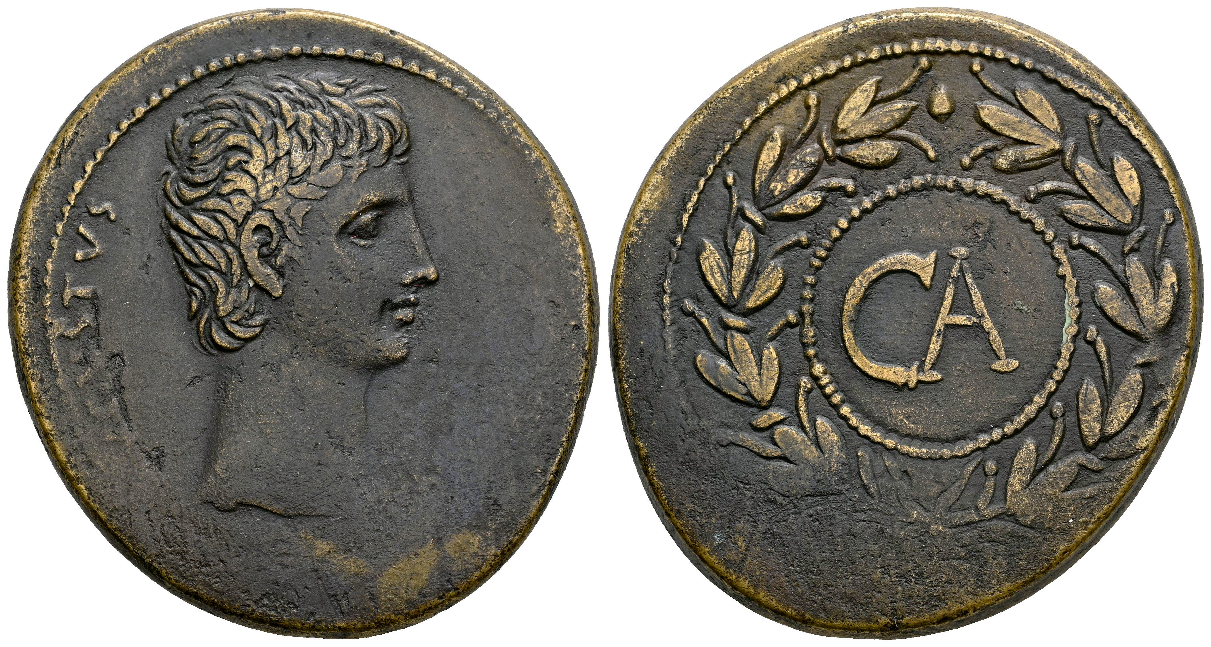 Augusto. Sestercio. 25 a.C. Ceca incierta en Asia. (Ric-I 501 Pergamum). (Bmcre-713 Pergamum). (RPC-I 2233 Asia). Anv.: AVGVSTVS. Cabeza desnuda a la derecha. Rev.: CA dentro de una corona rostral. Ae. 25,48 g.