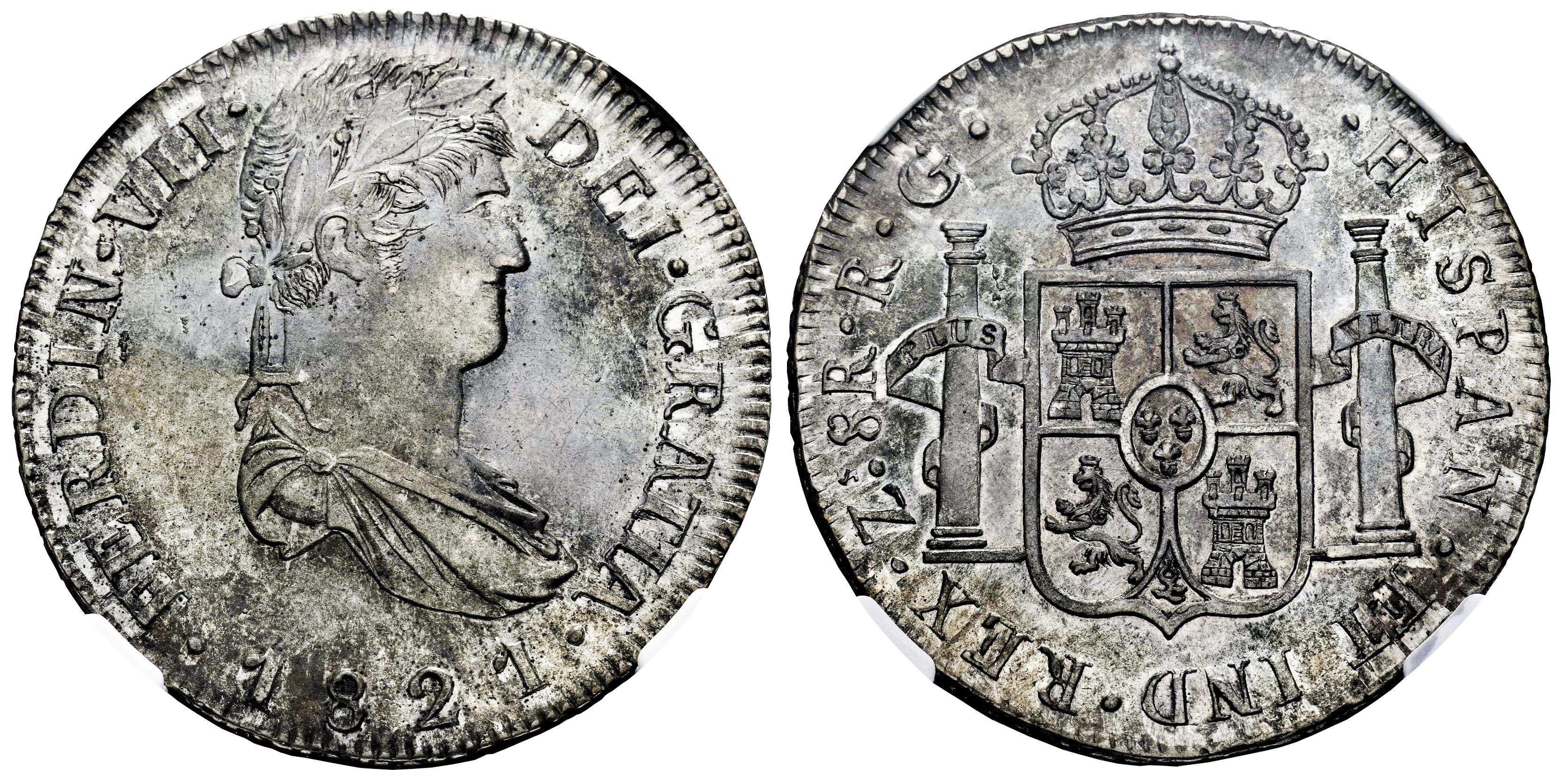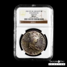 Fernando VII (1808-1833). 8 reales. 1821. Zacatecas. RG. (Cal-1465). Ag. Bonita pátina con restos de brillo original. Fuertemente acuñada con sus detalles bien definidos. Encapsulada por NGC como MS 61. Est...600,00.