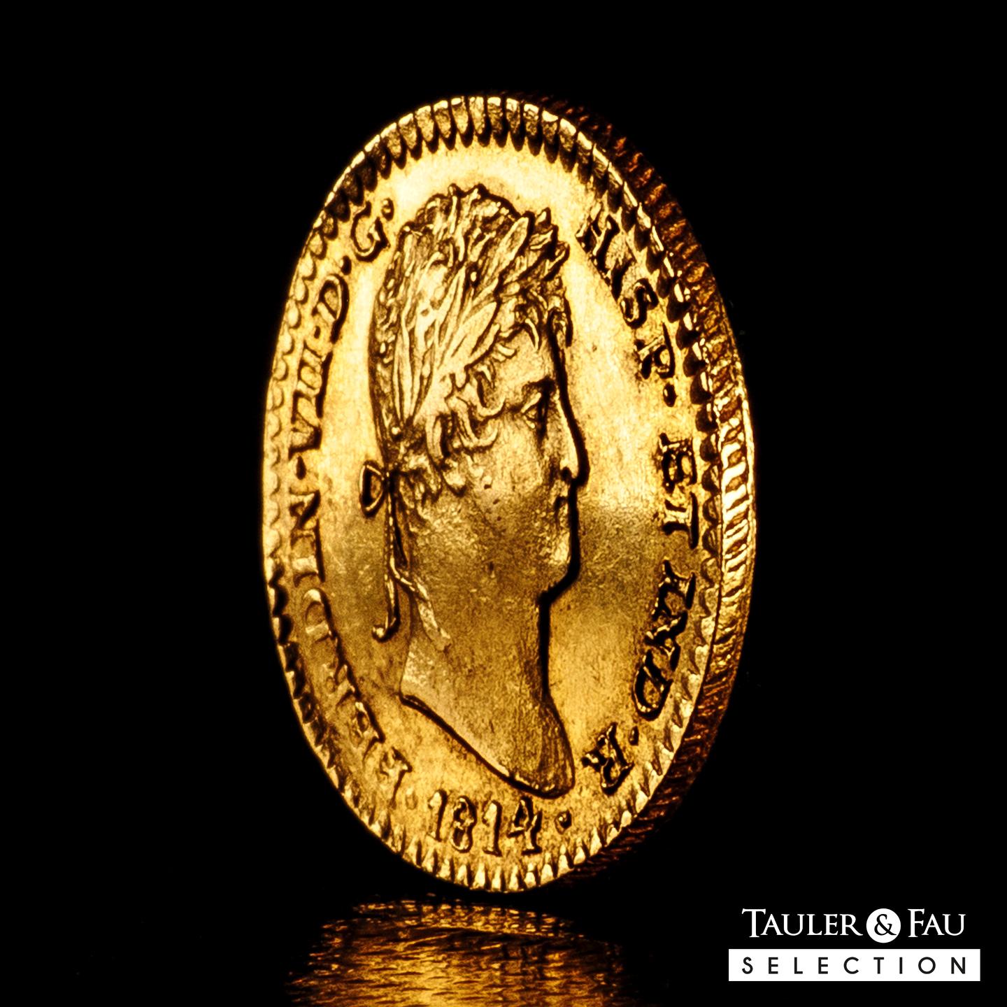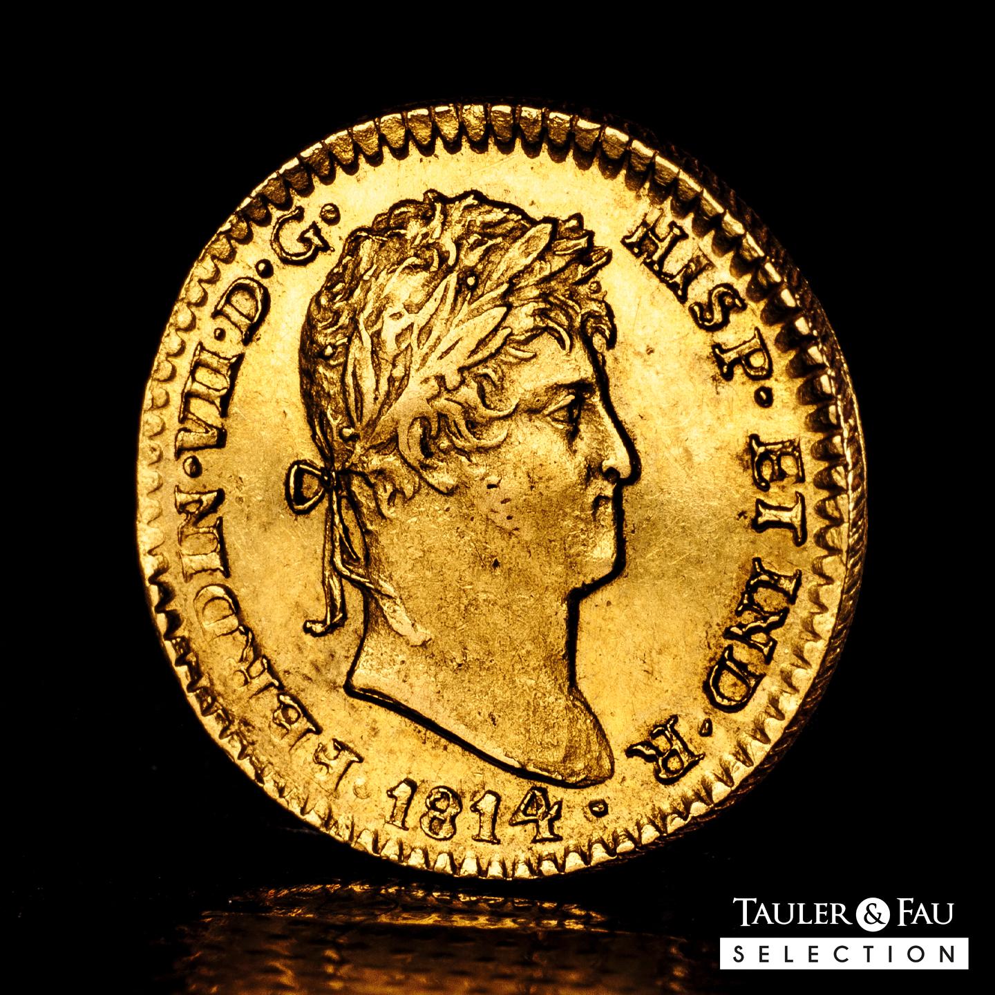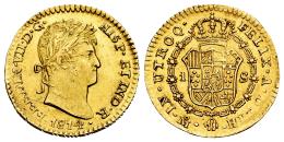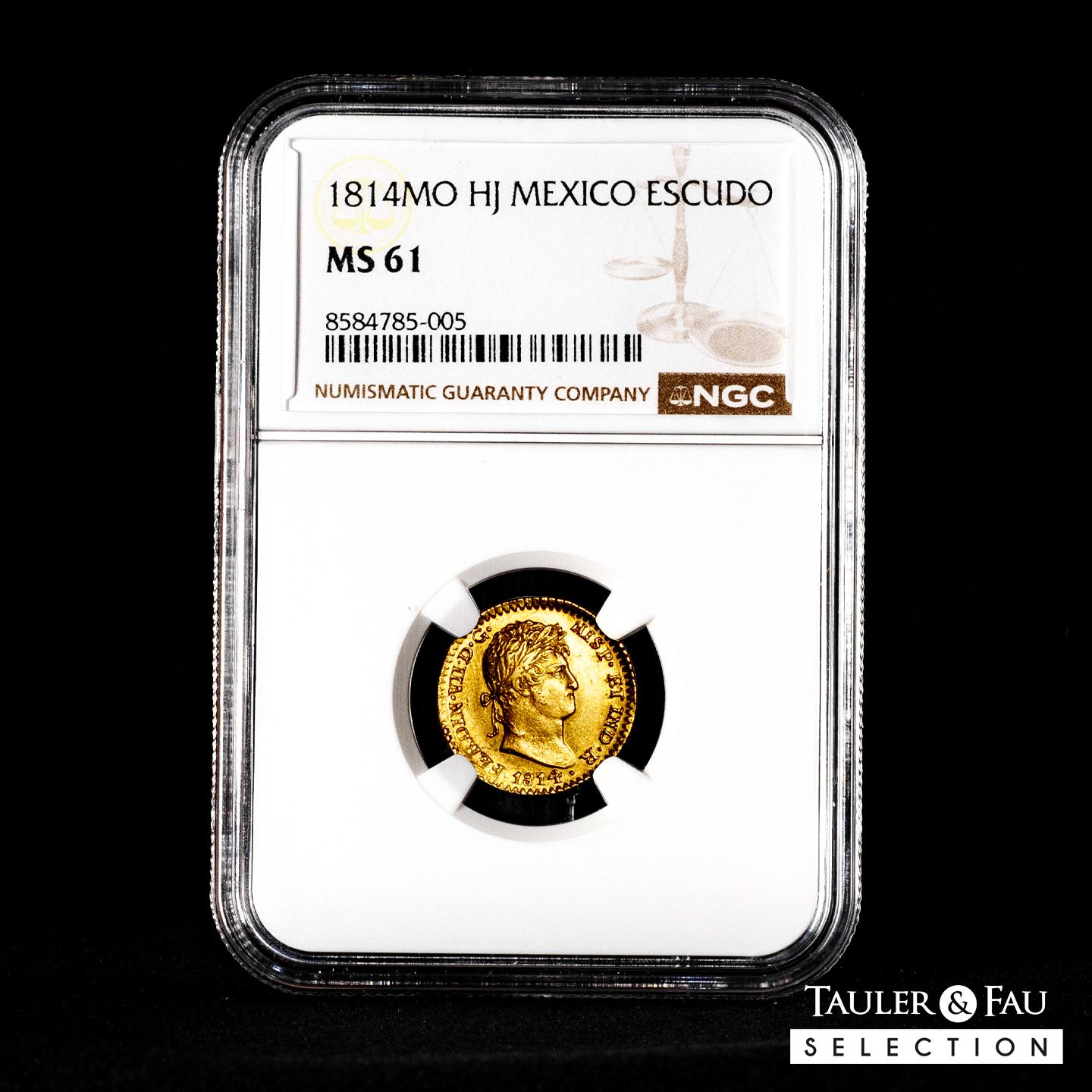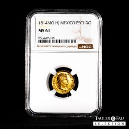 Fernando VII (1808-1833). 1 escudo. 1814. México. HJ. (Cal-1515). Au. 3,39 g. Primer año de busto laureado. Bonito color y brillo original. Escasa, más en esta conservación. Encapsulada por NGC como MS 61. Est...900,00.