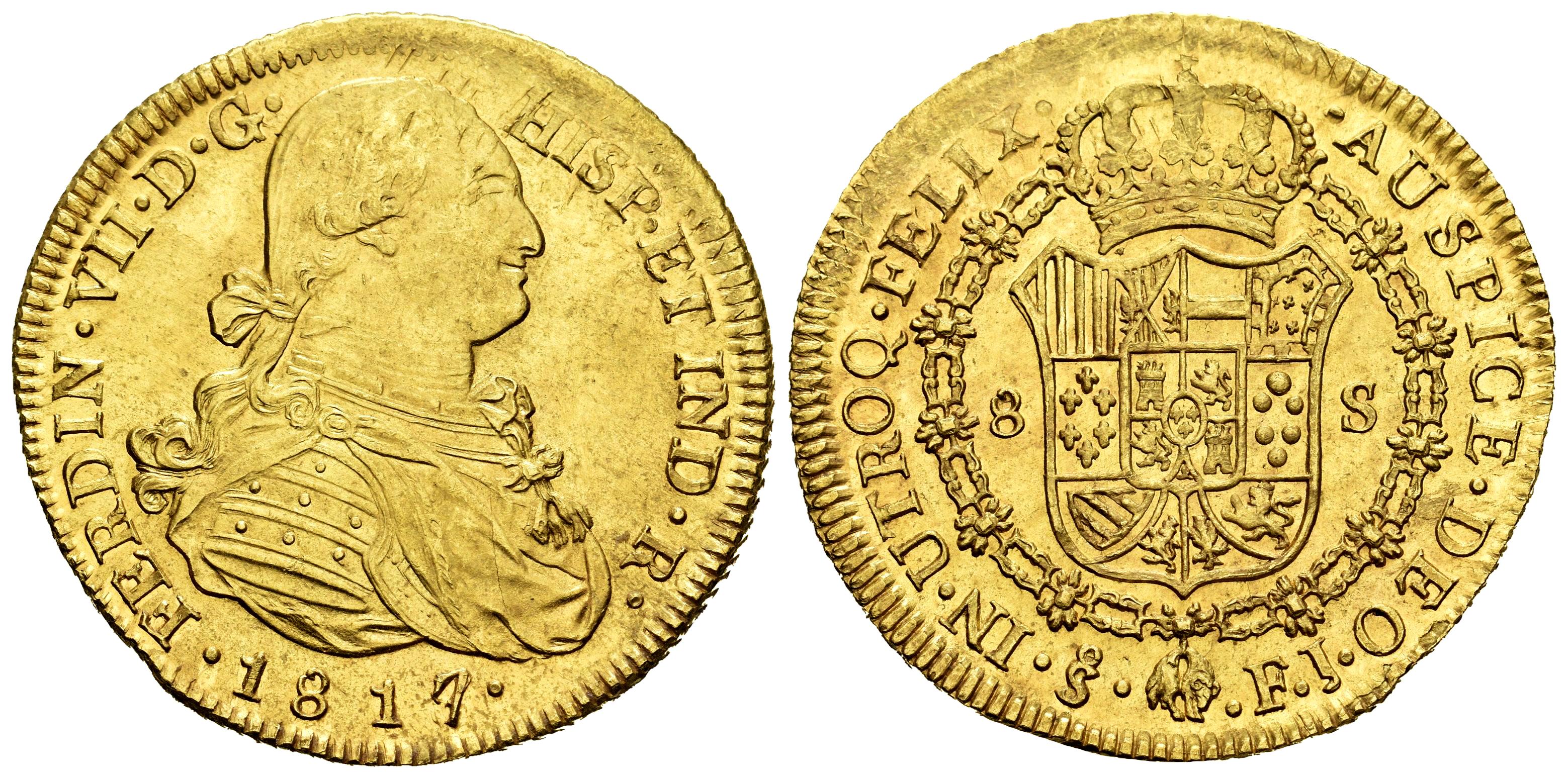 Fernando VII (1808-1833). 8 escudos. 1817/8. Santiago. FJ. (Cal-1877). (Cal onza-No cita). Au. 27,11 g. Busto de Carlos IV. Ínfimas rayitas superficiales, aun así muy atractivo ejemplar con todo su brillo original y fuertemente acuñada con todos sus detalles muy bien definidos. Rara, más en esta conservación. Algunos cuños con fecha 1818 fueron preparados por los republicanos antes de completar el grabado del tipo con las dos banderas, pero finalmente fueron rechazados (ya que habrían sido prueba de que una república independiente emitía moneda colonial) y se corrigieron con la fecha 1817. Este hecho explica la existencia de los aparentemente enigmáticos ejemplares 1817/8, acuñados a comienzos de 1818. SC-. Est...5000,00.