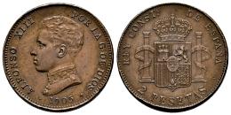 Centenario de la Peseta (1868-1931). Alfonso XIII (1886-1931). 2 pesetas. 1905*04. Madrid. V. (Cal-87). Ae. 9,94 g. Rarísima prueba en cobre. Golpecito en canto. EBC. Est...1500,00.