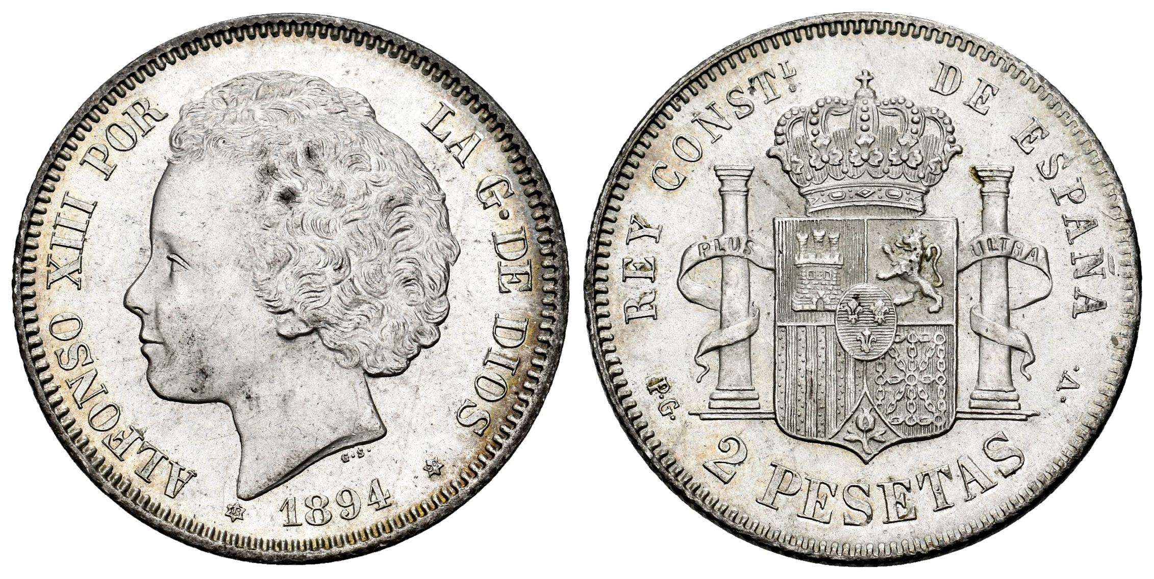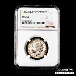 Centenario de la Peseta (1868-1931). Alfonso XIII (1886-1931). 2 pesetas. 1894*18-94. Madrid. PGV. (Cal-86). Ag. 10,01 g. Pleno brillo original. Muy rara en esta conservación. Encapsulada por NGC como MS 62. Est...900,00.