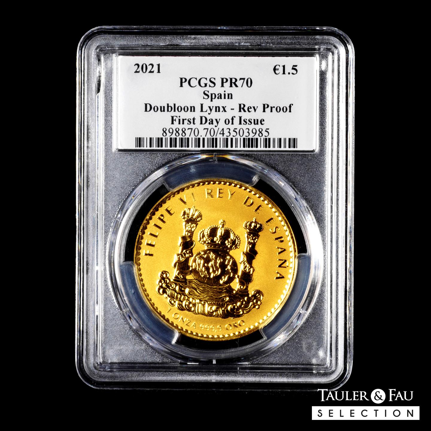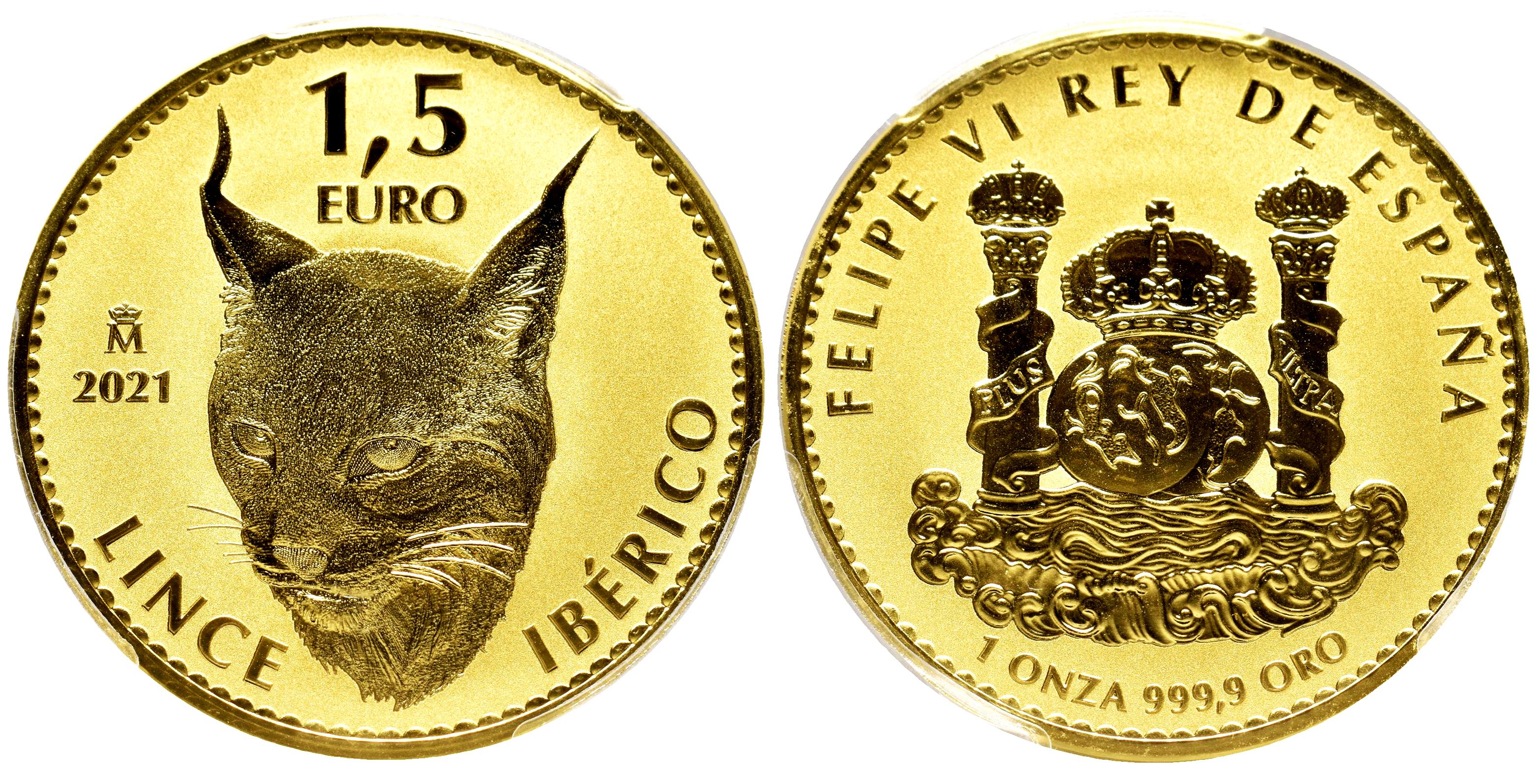 Felipe VI. 1,5 euros. 2021. Madrid. Au. 31,10 g. 0,999 milésimas. Lince Ibérico. Encapsulada por PCGS como PR 70. Est...3500,00.