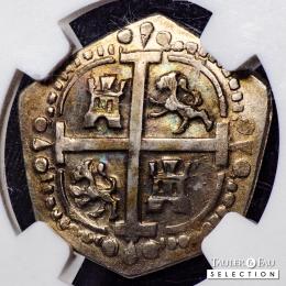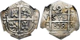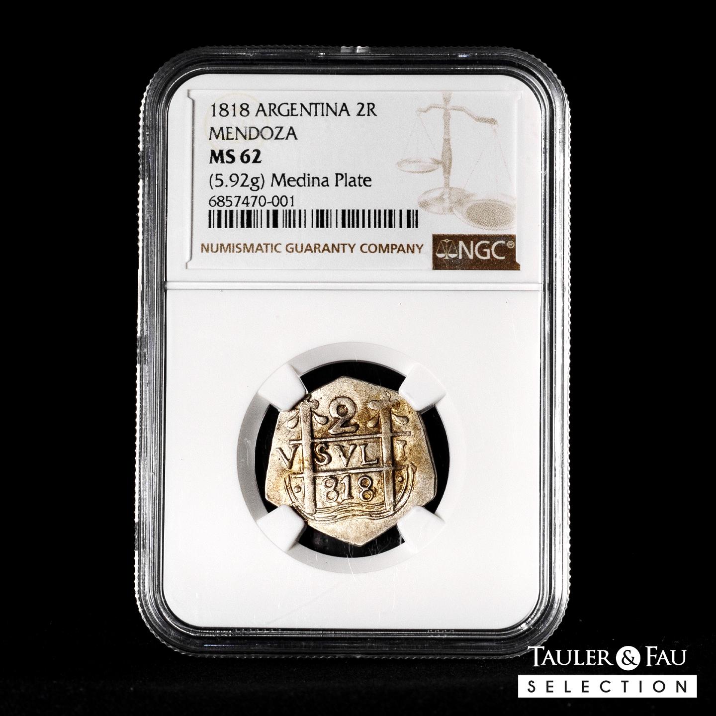 Argentina. 2 reales. ND “818” (ca. 1823, emisión clandestina). Mendoza. (Km-No cita). (Janson-10.1). (Medina-267, mismo ejemplar). . 5,92 g. Macuquina imitación. Acuñada sobre un amplio cospel con una definición excepcional para el tipo, muestra una cruz completa con leones y castillos bien delineados, así como pilares y olas perfectamente visibles en el reverso.