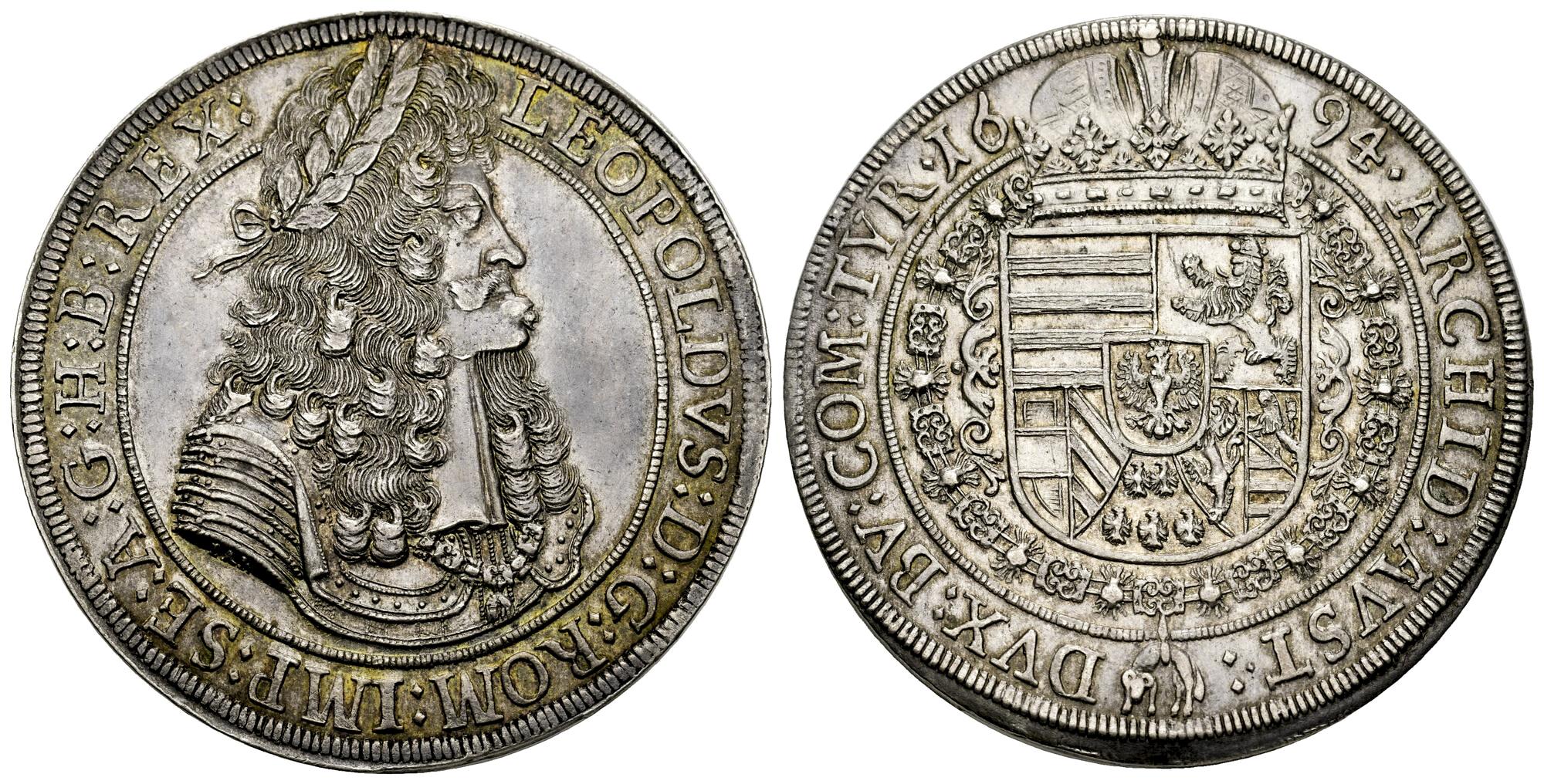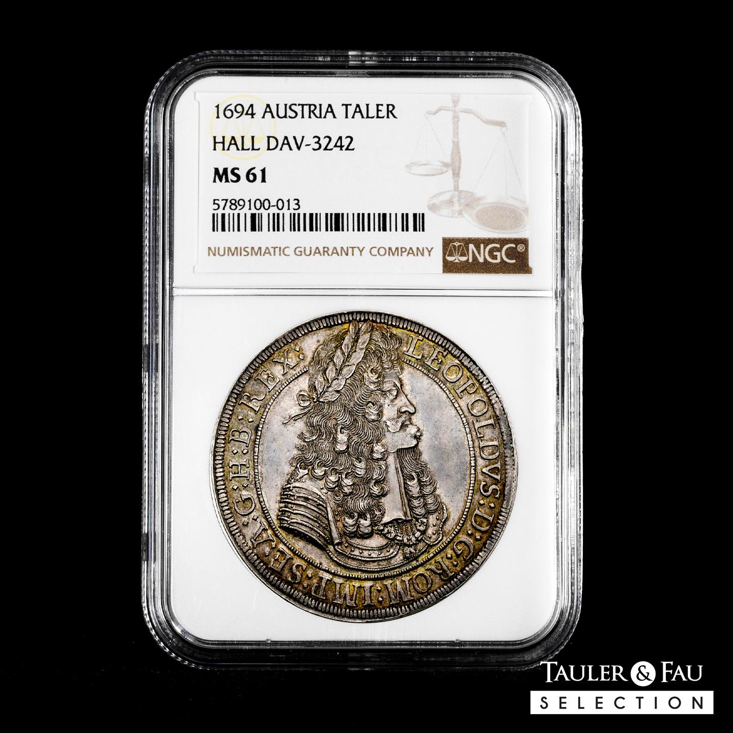Austria. Leopold I (1657-1705). 1 taler. 1694. Hall. (Dav-3242). Ag. Precioso color. Brillo original. Encapsulada por NGC como MS 61. Solamente 2 ejemplares mejor conservados según el censo de NGC. Ex H.D. Rauch (12/12/2013), lote 2688; Ex Tauler&Fau 118 (22/11/2022), lote 315. Est...1200,00.