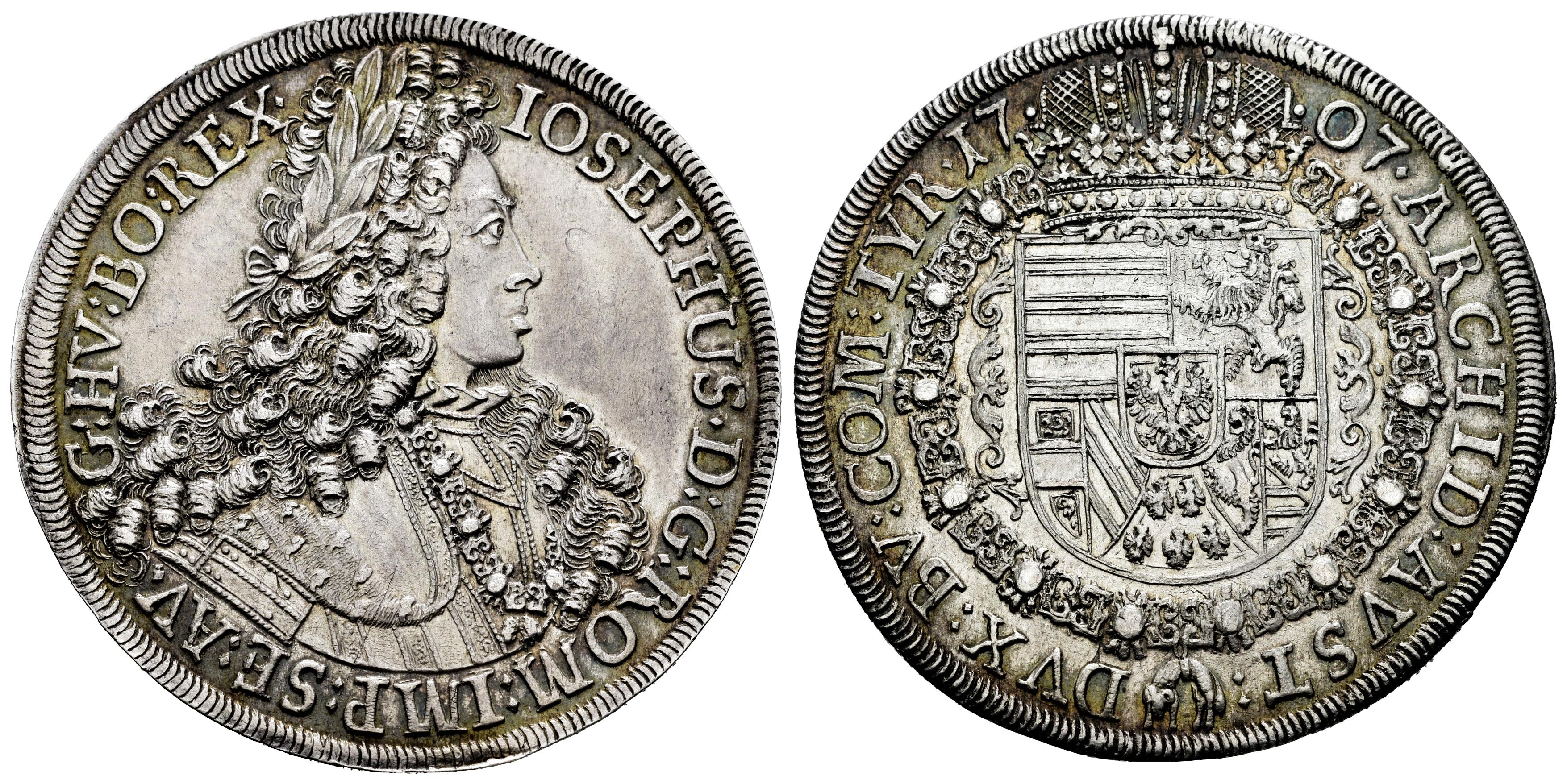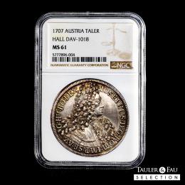 Austria. Joseph I (1705-1711). 1 taler. 1707. Hall. (Km-1438.1). (Dav-1018). Ag. Suave pátina y restos de brillo original. Encapsulada por NGC como MS 61. Est...800,00.