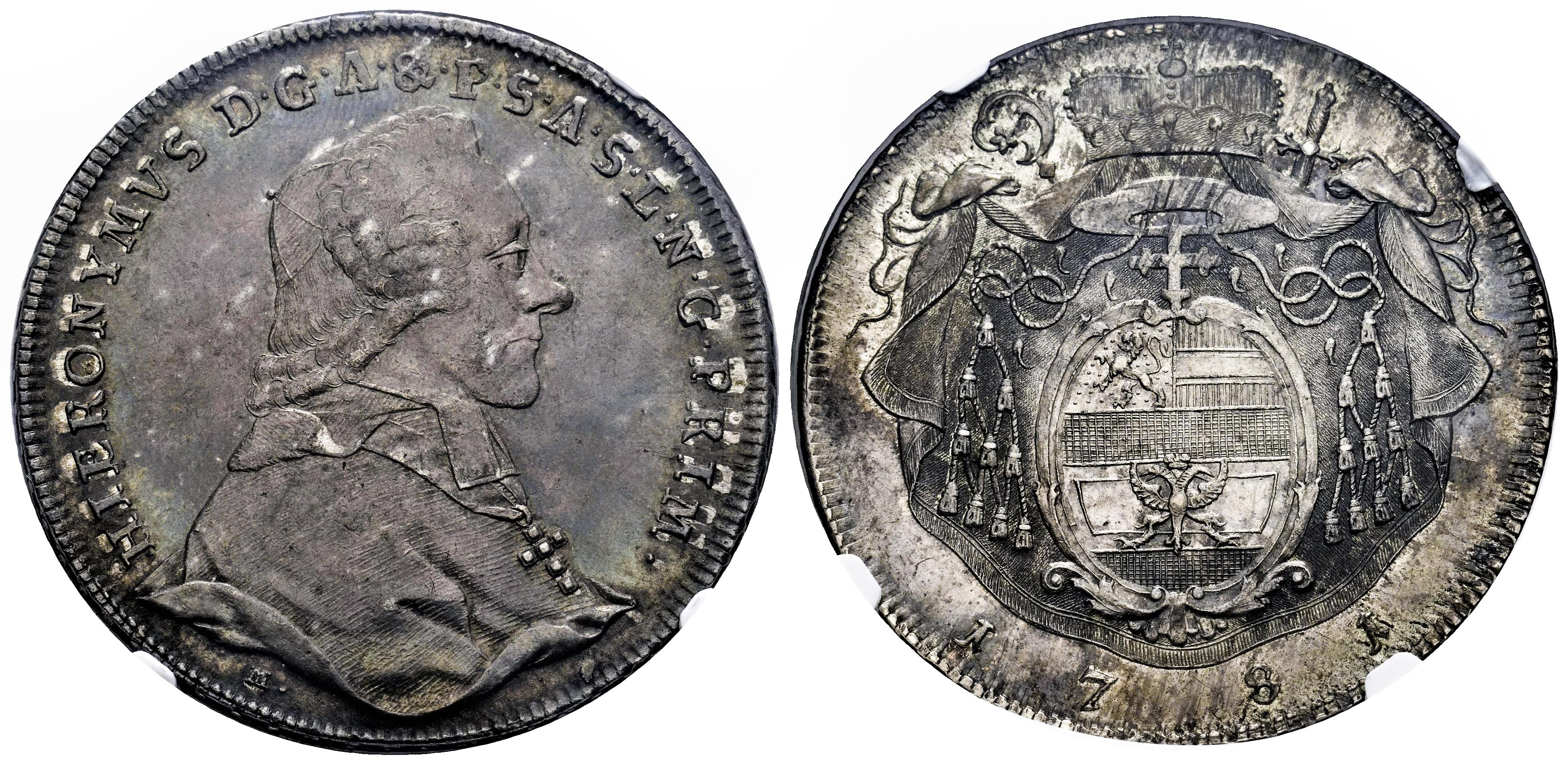 Austria. Hieronymus Graf Colloredo. 1 taler. 1781. Salzburgo. (Km-435). (Dav-1263). Ag. Preciosa pátina de monetario con brillo original subyacente. Rara en esta conservación. Encapsulada por NGC como MS 63. Solamente 1 ejemplar mejor conservado según el censo de NGC. Ex Cambi & Crippa Num. 620 (21/09/2021), lote 283. Est...750,00.