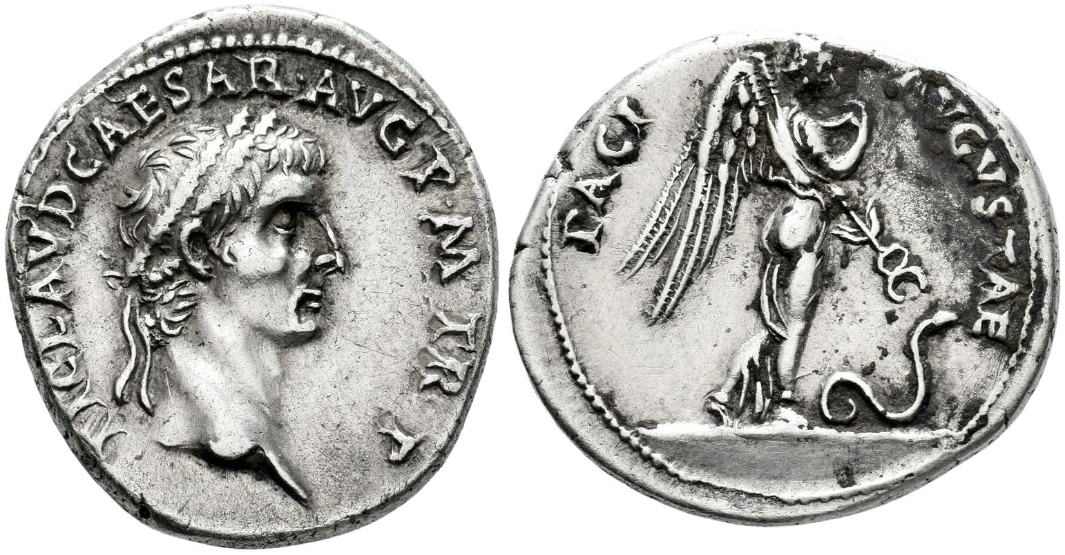 Claudio I. Denario. 41-42 d.C. Roma. (Ric-10). (Rsc-51). (Bmc-22). Anv.: TI CLAVD CAESAR AVG P M TR P. Busto laureado a derecha. Rev.: PACI AVGVSTAE, Paz-Némesis, alada y vestida, avanzando a derecha; sostiene con la mano derecha un pliegue del manto bajo el mentón y con la izquierda un caduceo alado apuntando hacia abajo, en dirección a una serpiente que se desliza a la derecha. Ag. 3,76 g. Precioso retrato en alto relieve y de excelente estilo. Leves depósitos en reverso. Muy rara, más en esta extraordinaria conservación. EBC/EBC-. Est...4000,00.