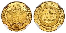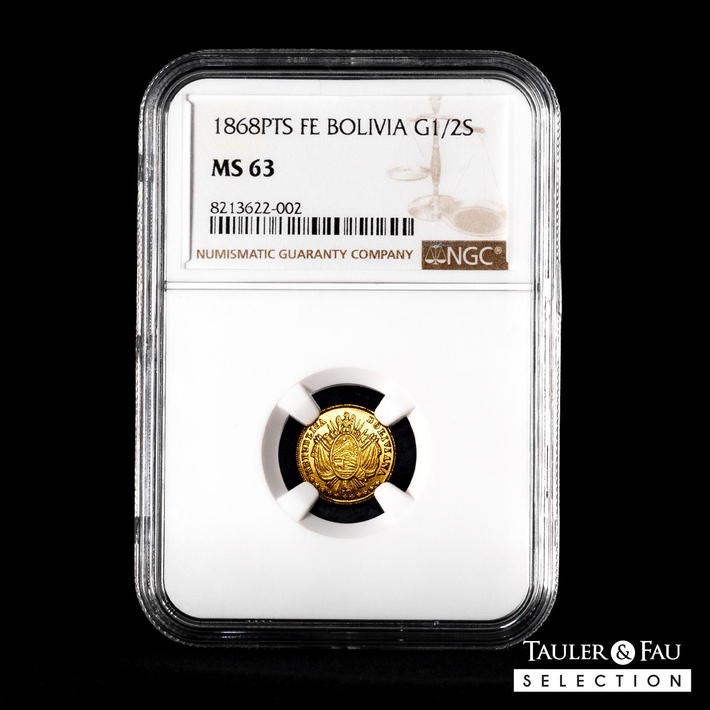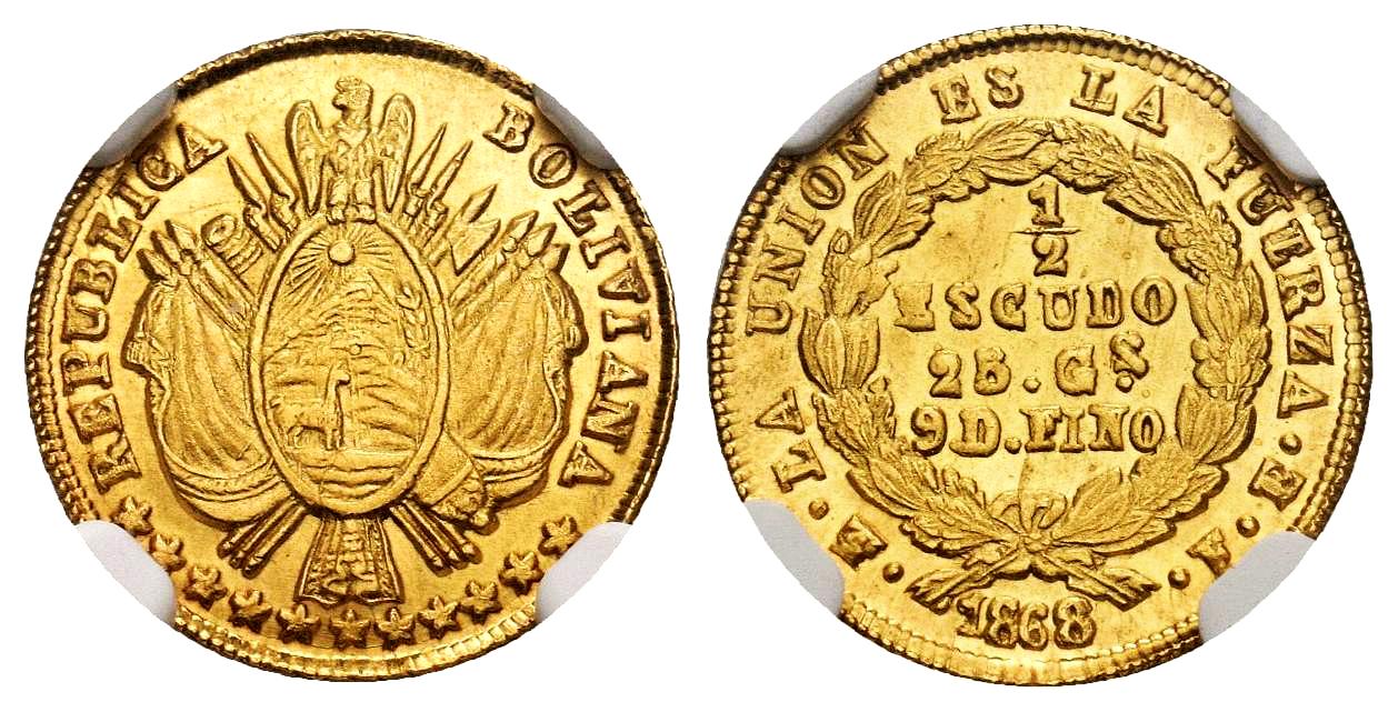 Bolivia. 1/2 escudo. 1868. Potosí. FE. (Km). Au. Buena acuñación con un color amarillo intenso y brillo original. Muy rara en esta conservación. Encapsulada por NGC como MS 63. Solamente 2 ejemplares mejor conservados según el censo de NGC. Est...900,00.