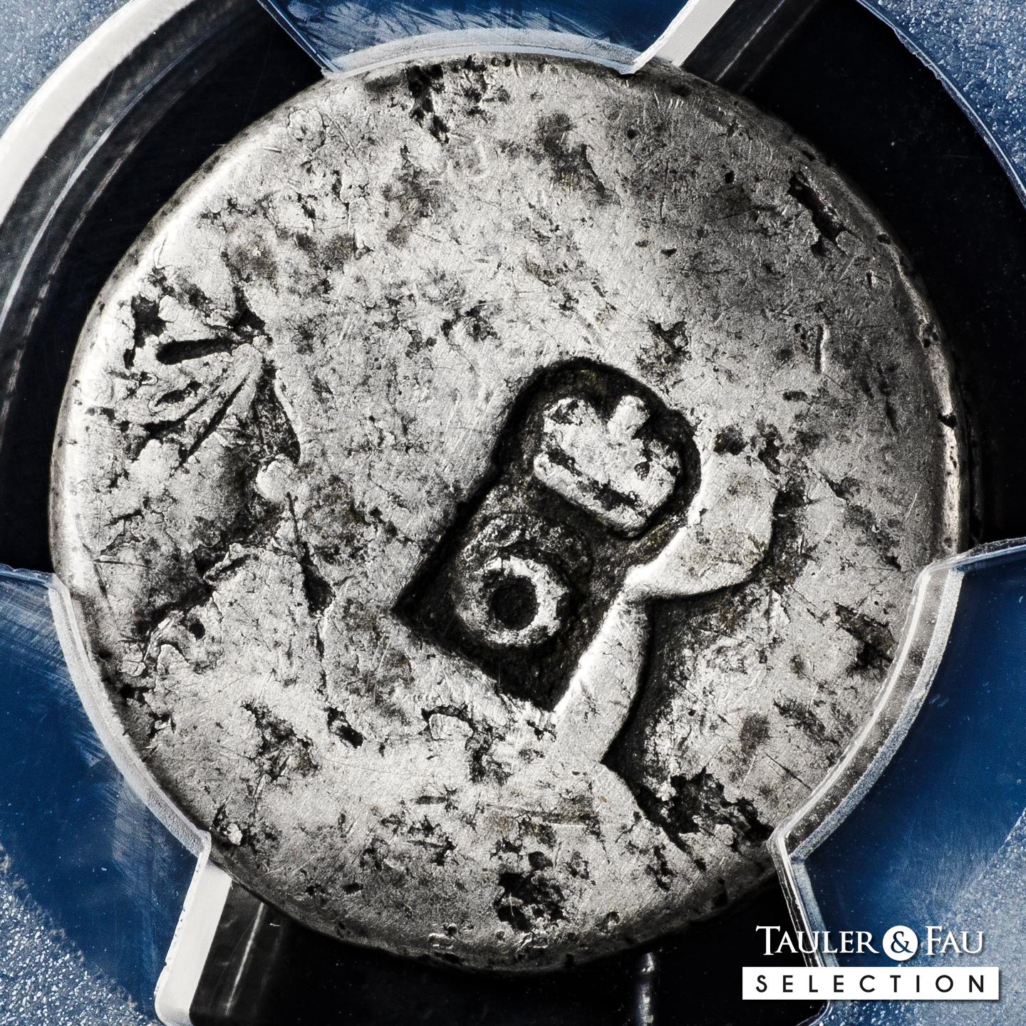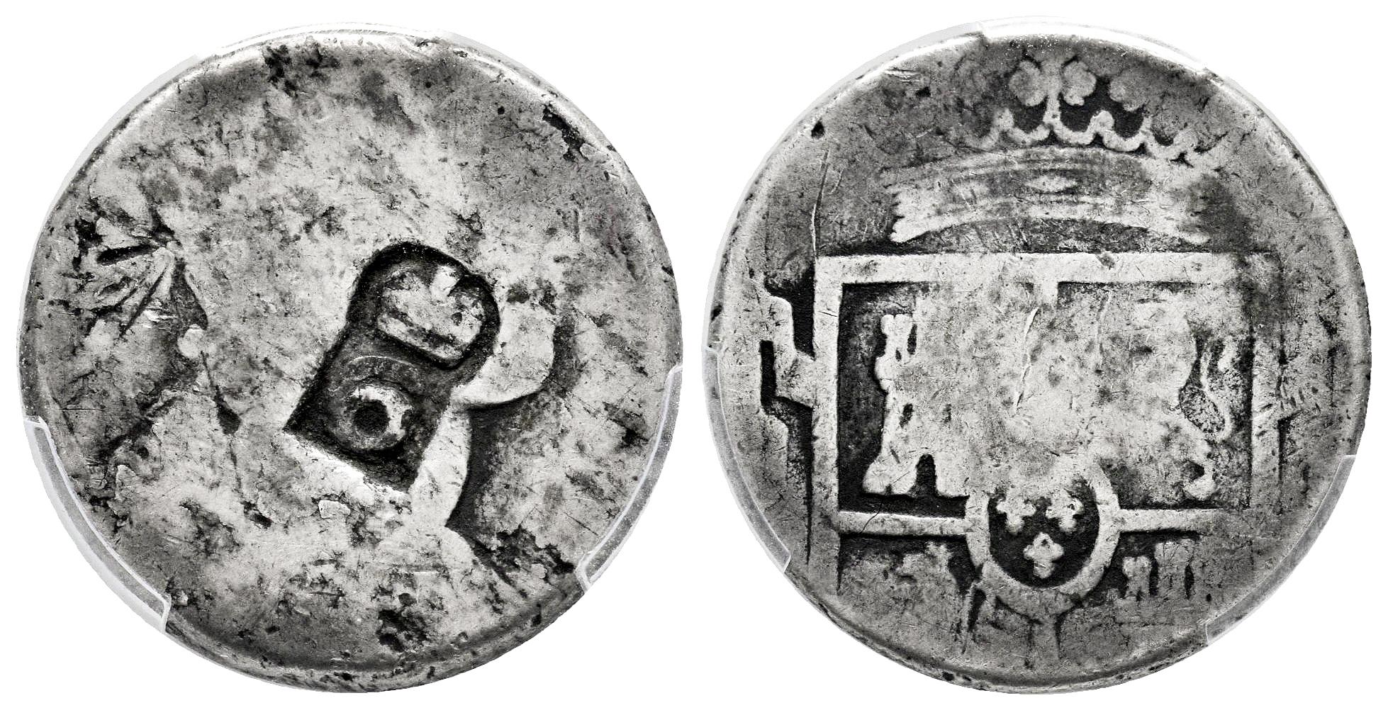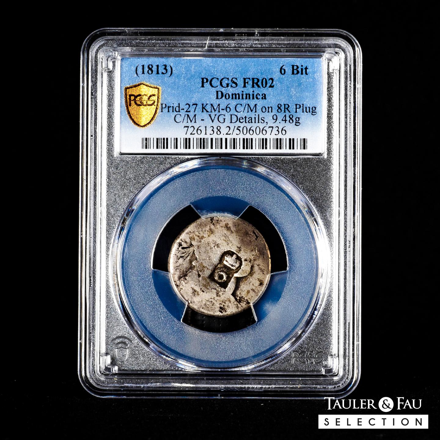Dominica. George III (1760-1820). 6 Bitts (4 shillings 6 Pence). ND (1813). (Km-6). (Pridmore-27). Ag. 9,48 g. Contramarca bien definida con un "6" coronado sobre el segmento circular central de un 8 reales de Lima de Fernando VII, por decreto de las autoridades locales del 21 de agosto de 1813. Contramarca bien visible sobre el característico busto indígena de la serie de Lima, acuñada únicamente entre 1809 y 1811. Por lo general, resulta difícil identificar la ceca en este tipo de piezas, ya que la zona donde se aplicaba la contramarca suele aparecer muy desgastada y muchos ejemplares presentan daños. Más allá de reconocer al gobernante representado, apenas existen otros rasgos distintivos. En este caso, por el estilo del busto, puede atribuirse sin ninguna duda a la ceca de Lima. Interesante emisión de las Indias Occidentales. Muy rara. Encapsulada por PCGS como FR02 - C/M on 8R Plug VG Details. Est...1000,00.