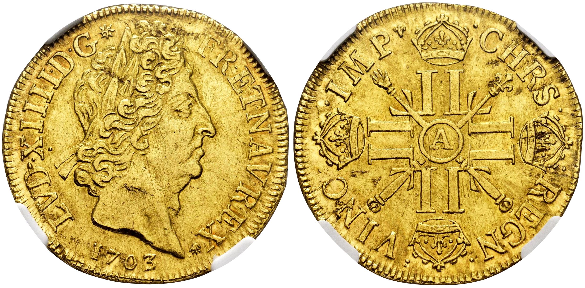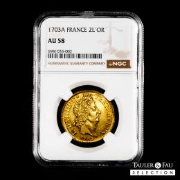 Francia. Louis XIV (1643-1715). 2 Louis d´or. 1703. París. A. (Km-335.1). (Fr-435). (Gad-253). Au. Brillo original. Muy rara, más en esta conservación. Encapsulada por NGC como AU 58. Solamente 1 ejemplar mejor conservado según el censo de NGC. Est...5000,00.