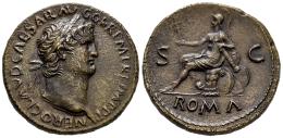 Nerón. Sestercio. 65 d.C. Roma. (Ric-I 273). (Bmcre-173). Anv.: NERO CLAVD CAESAR AVG GER P M TR P IMP P P. Cabeza laureada a la derecha. Rev.: Roma, con casco y drapeada, sedentea la izquierda sobre una coraza, con el pie derecho sobre un casco, sosteniendo una Victoria en la mano derecha extendida y apoyando la izquierda sobre parazonium; a la derecha, escudos colocados en el suelo, S-C en el campo, ROMA en el exergo. Ae. 28,24 g. Atractivo ejemplar con una bonita pátina marrón. EBC. Est...3000,00.