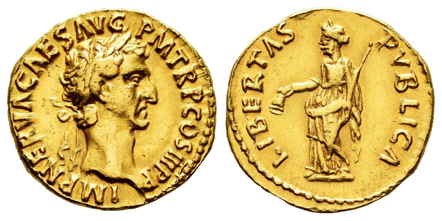 Nerva. Áureo. 97 d.C. Roma. (Ric-19). (Calicó-976). Anv.: IMP NERVA CAES AVG P M TR P COS III P P. Cabeza laureada a la derecha. Rev.: LIBERTAS PVBLICA. Libertas, drapeada y en pie a la izquierda, sosteniendo pileus y cetro. Au. 7,56 g.