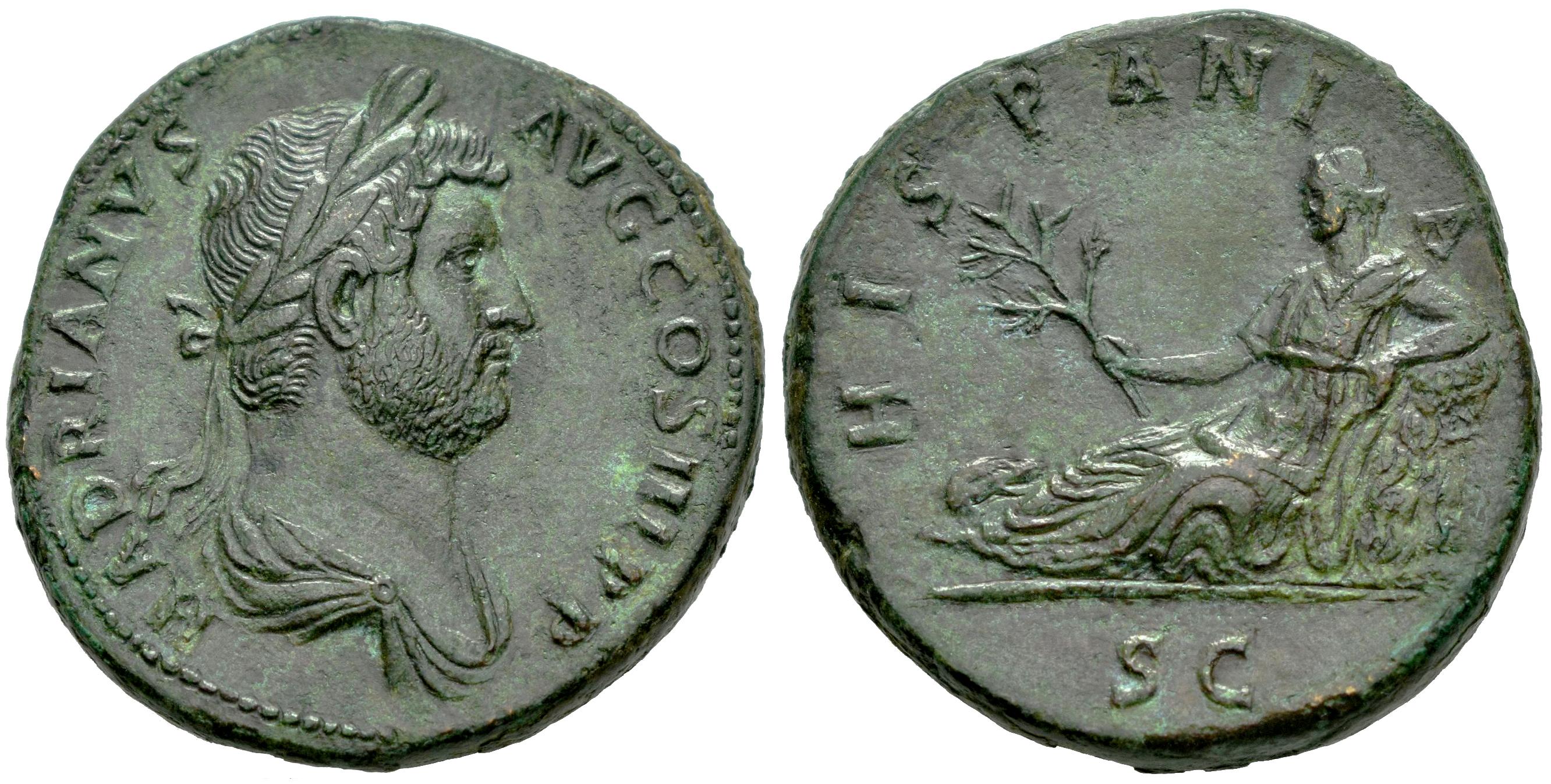 Adriano. Sestercio. 134-138 d.C. Roma. (Ric-II 851 var.). (Banti-448). (C-832). Anv.: HADRIANVS AVG COS III P P. Busto laureado y drapeado a la derecha. Rev.: HISPANIA. Hispania reclinada a la izquierda sosteniendo una rama y apoyando el codo en una roca; conejo a la derecha delante. Ae. 27,69 g. Campos ligeramente repasados, aun así bonito ejemplar. Rara. EBC+/EBC. Est...2000,00.