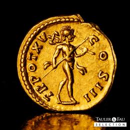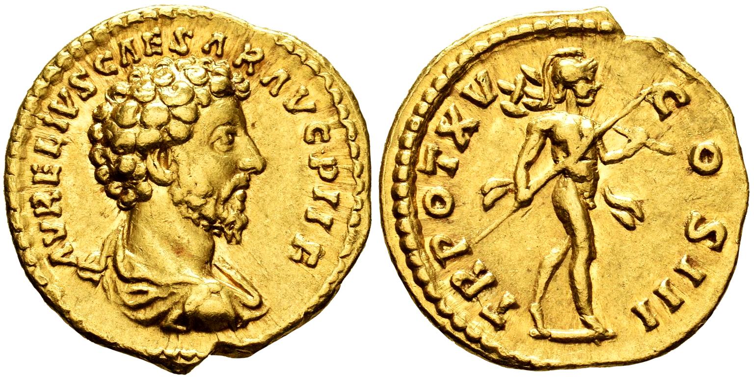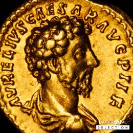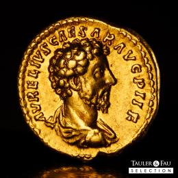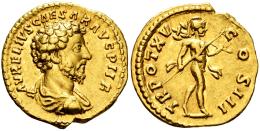 Marco Aurelio. Áureo. 160-161 d.C. Roma. (Ric-488). (Calicó-1981). (Bmc-1017). Anv.: AVRELIVS CAESAR AVG P II F. Busto con cabeza desnuda, drapeado y con coraza a derecha. Rev.: TR POT XV COS III. Marte avanzando a la derecha, portando lanza y trofeo. Au. 7,31 g. Bonito color y restos de brillo original. Acuñación bien centrada. Escasa, más en esta conservación. EBC. Est...7000,00.