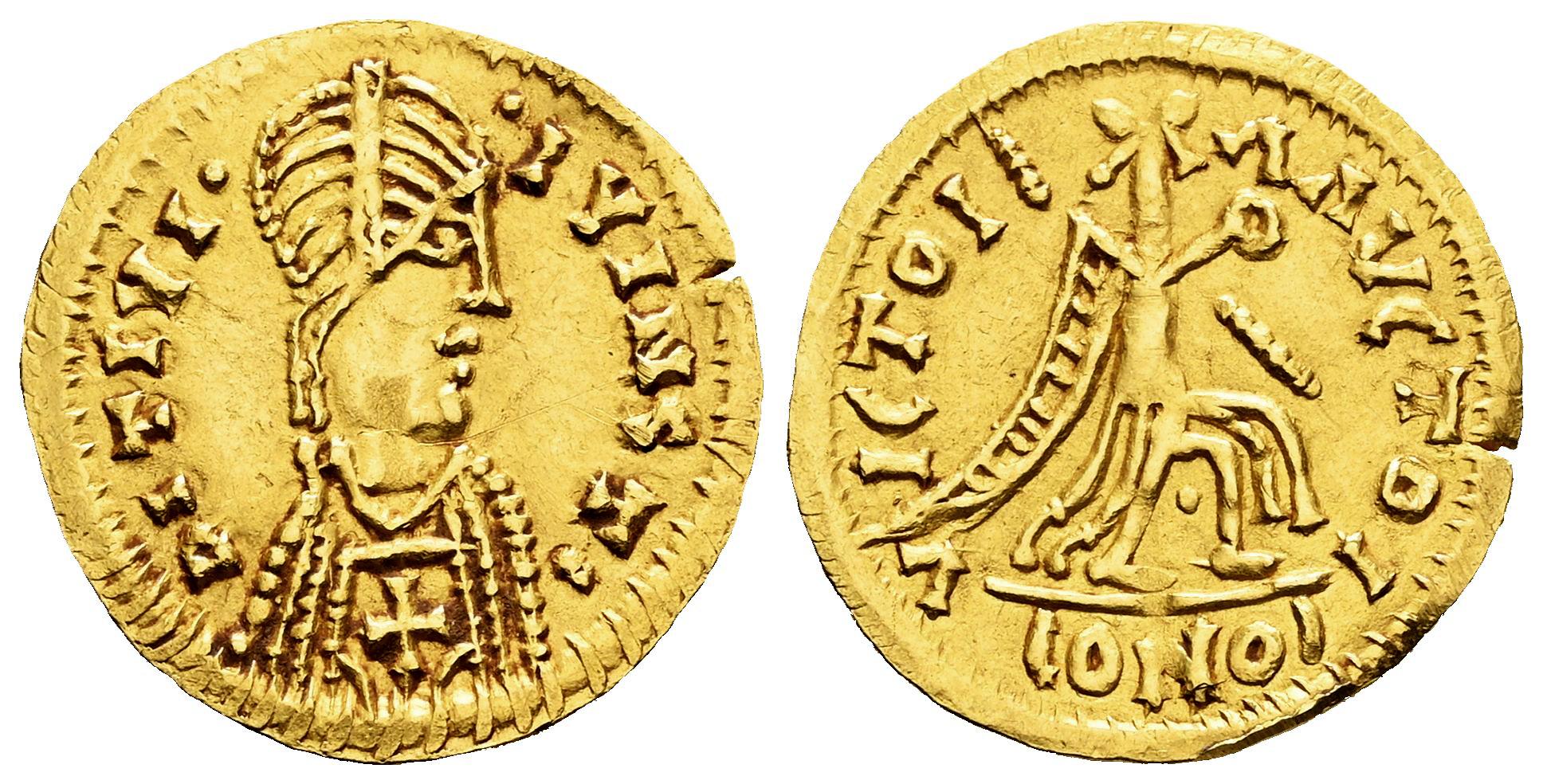 Acuñaciones Pseudoimperiales. A nombre de Justino I. Tremissis. Barcelona. (Tomasini-269/70 var.). Anv.: DITIVI· / ·IVINSTI. Busto con diadema de perlas, drapeado y coraza hacia la derecha con una cruz en el pecho. Rev.: V / ICTOI / AAVCTOI. Victoria avanzando hacia la derecha, sosteniendo una corona y una rama de palma; (ONO) en exergo. Au. 1,23 g. Muy escasa. EBC-. Est...1500,00.