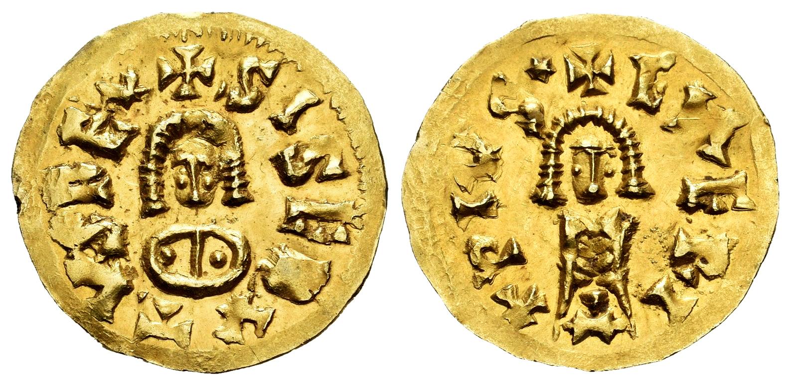 Sisebuto (612-621). Tremissis. Emérita (Mérida). (R. Pliego-285c var.). (Cnv-258.2 var.). (Miles-192b var.). Anv.: + SISEBVT.VSREx. Rev.: + EMERI /T/ APIVS (Estrella de 6 puntas). Au. 1,51 g. Variante aparentemente inédita. Presenta un pequeño triángulo dividiendo la leyenda del anverso, entre la T y la V de "SISEBVTVS". Restos de brillo original. Rara. EBC-. Est...1200,00.