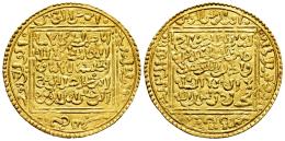 Almohades. Abu Hafs `Umar Al-Murtada. Dinar. 646-665 H. Sin ceca. (Vives-2079). (Hazard-532). Au. 4,63 g. Atractivo ejemplar. EBC. Est...1500,00.