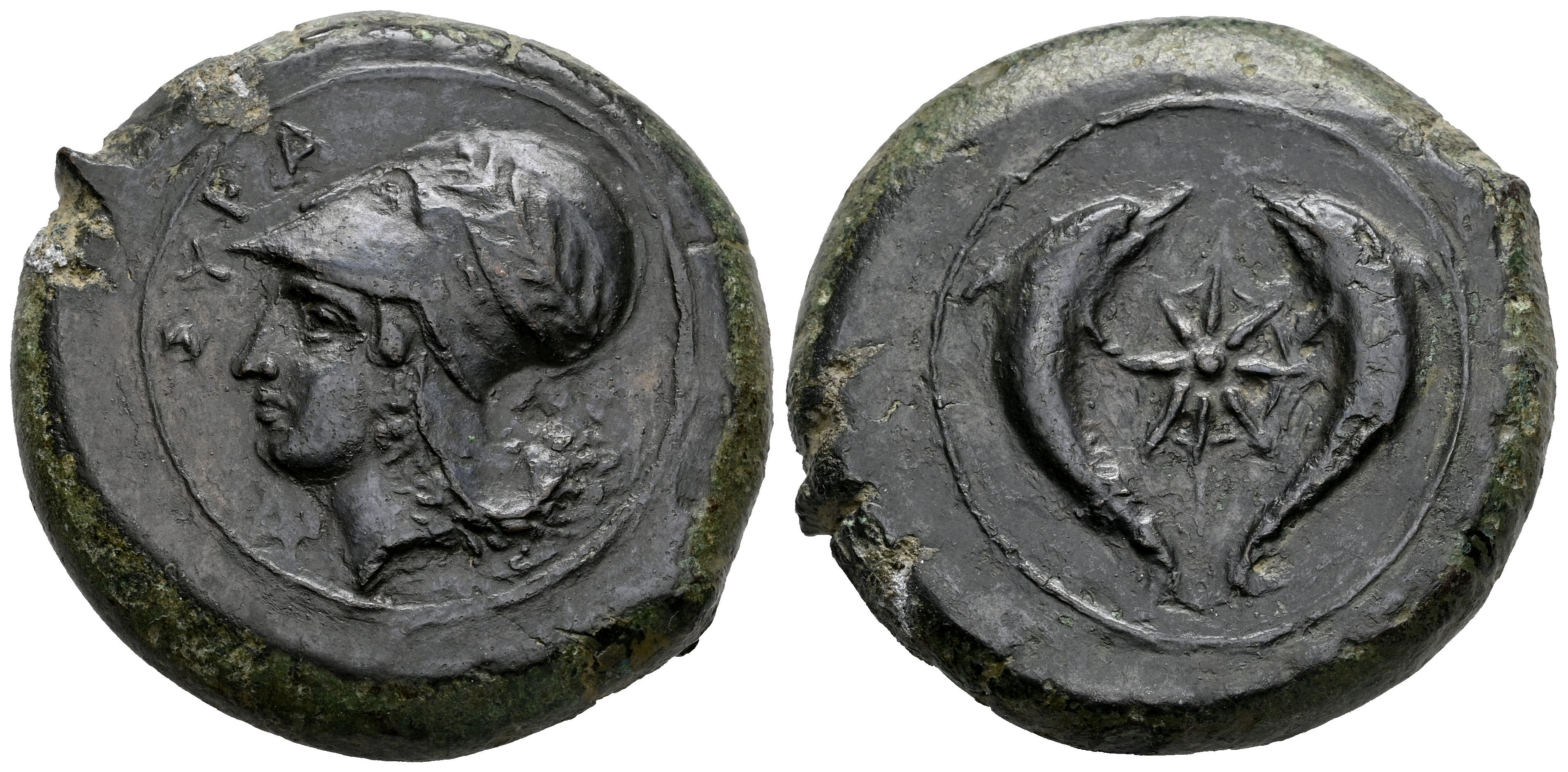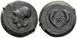 Sicilia. Siracusa. AE 33. 405-367 a.C. Tiempos de Dionysios I. (CNS-II 62). (Sng Ans-454/69). (Hgc-2, 1436). Anv.: Cabeza de Atenea a la izquierda, con casco corintio decorado con corona; ΣYPA delante. Rev.: Estrella de mar entre dos delfines. Ae. 33,94 g. Muy bien centrada. Rara así. EBC-. Est...500,00.