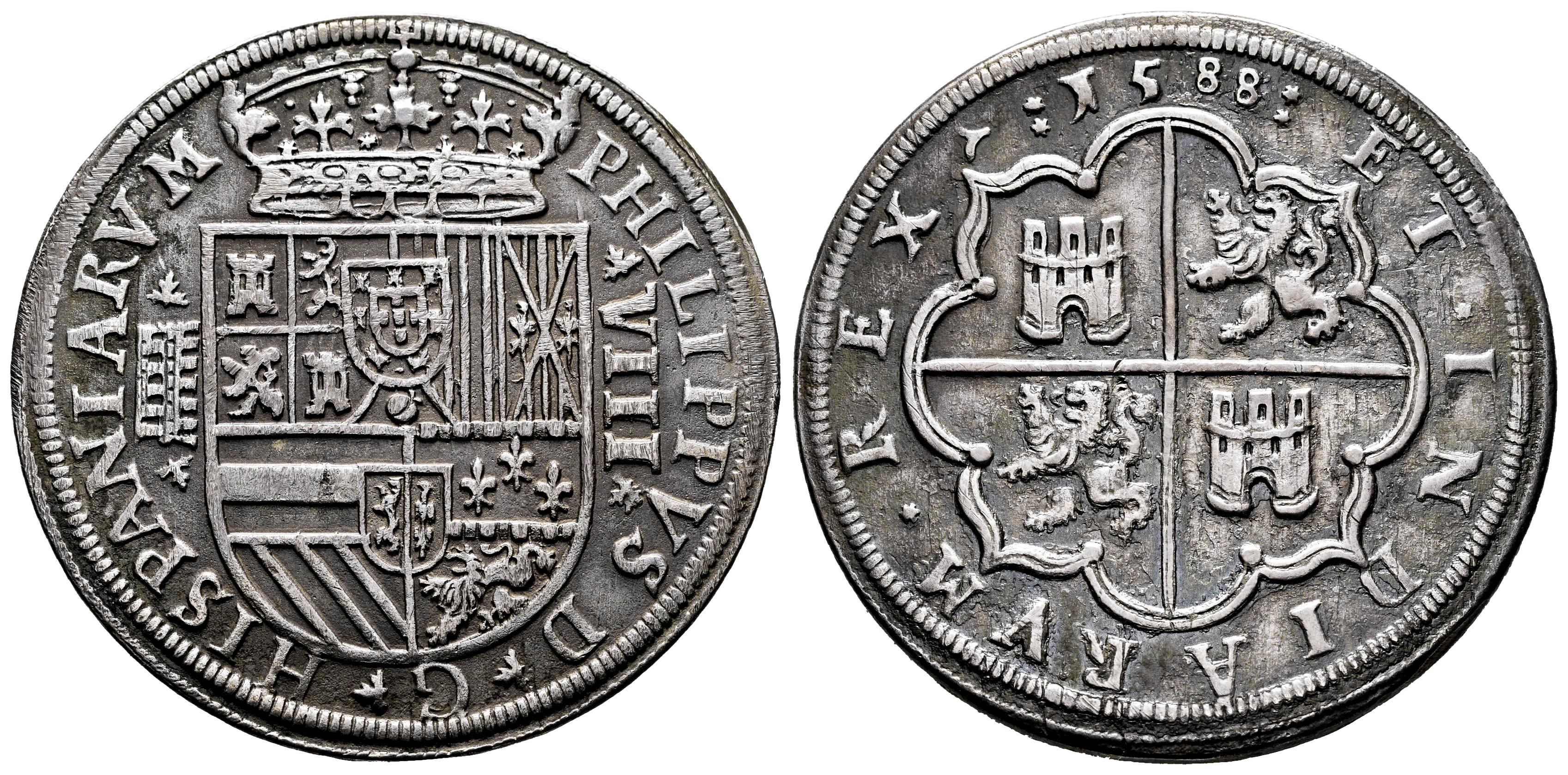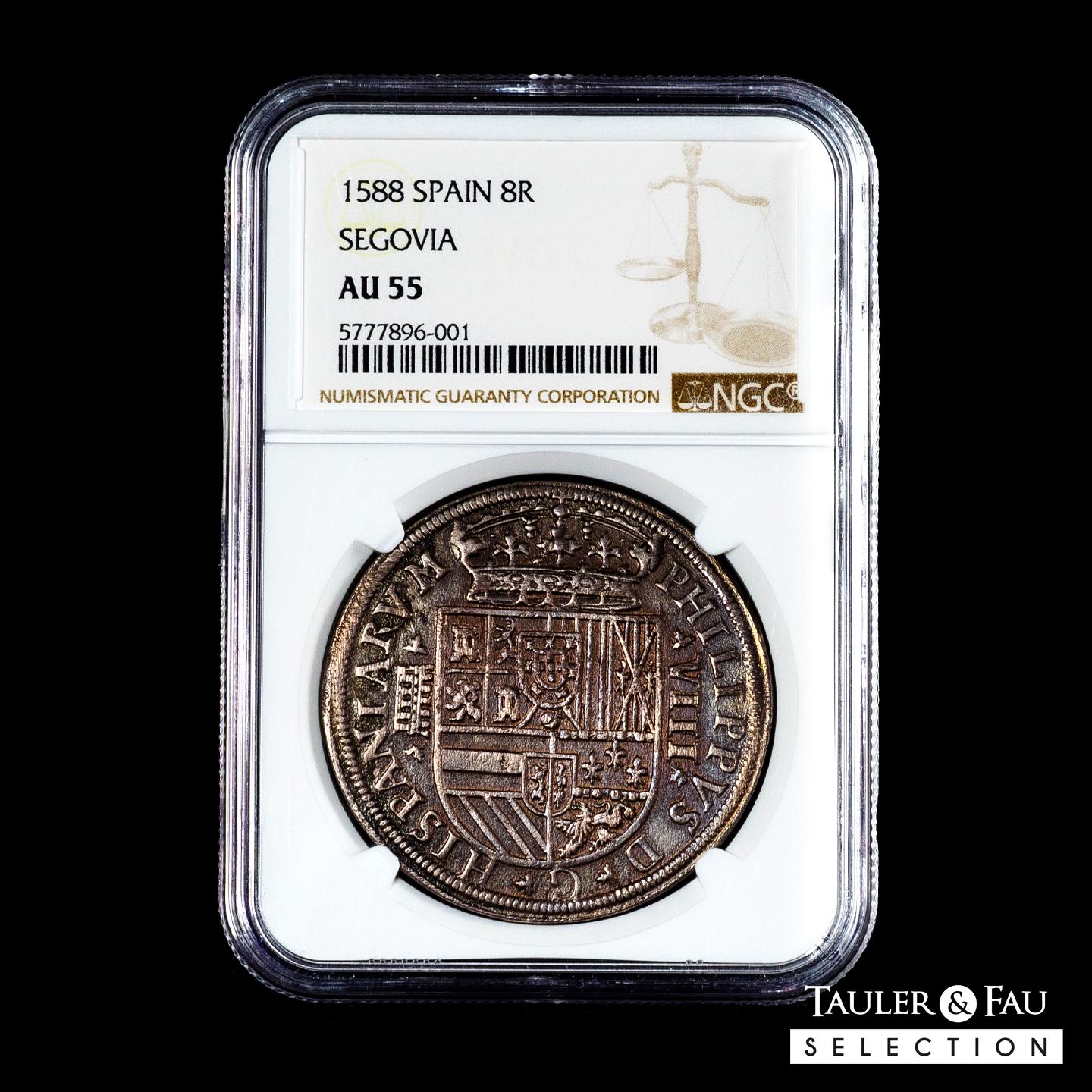 Felipe II (1556-1598). 8 reales. 1588. Segovia. (Cal-692). Ag. Acueducto de 5 y 6 arcos y 2 pisos. Fecha pequeña. Adornos florales acotando ceca y valor, y decorando la leyenda del anverso. Dobles estrellitas flanqueando la fecha, y singulares decorando la leyenda del reverso que acaba con ornamento diferente. Ligera pátina con suaves tonos malva y azulados. Escasa. Encapsulada por NGC como AU 55. Est...1500,00.